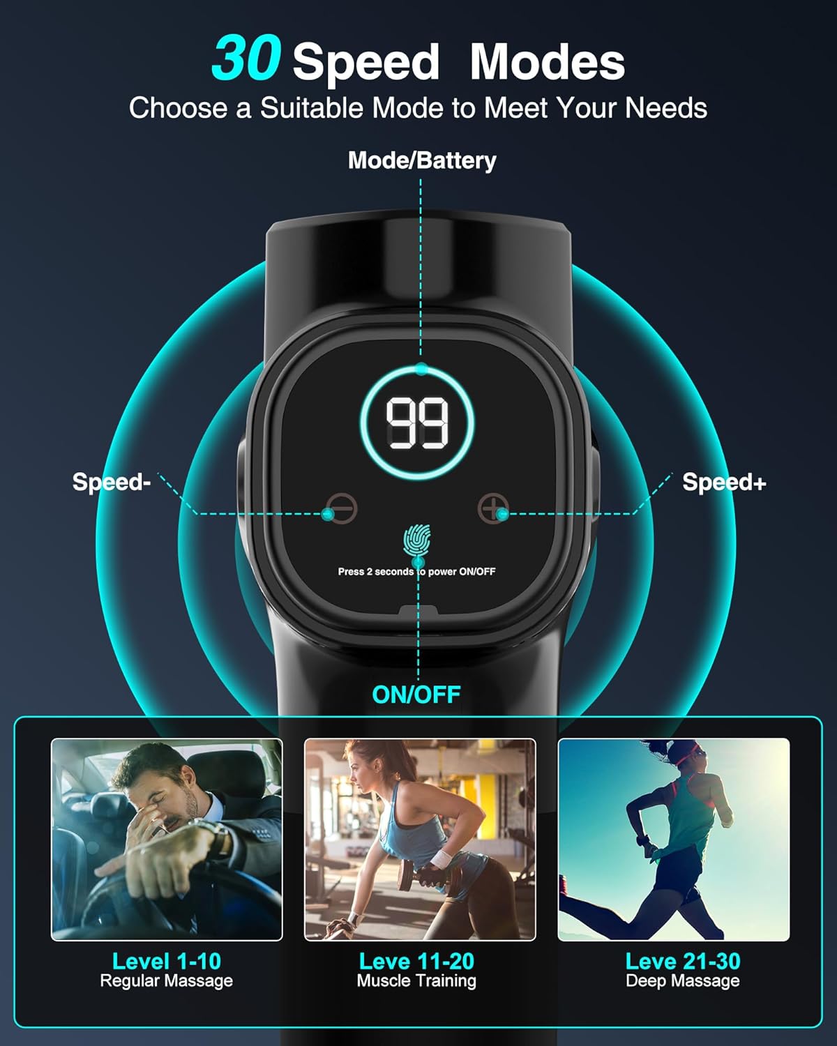 30 Speeds & 6 Massage Heads:This deep tissue massager is equipped with 6 different massage heads to help users to relax different body parts. Round head – relaxes sensitive muscles, back, legs and waist;Long taper – relieves deep tissue pain, knees, joints, palms and soles;Spade head – relaxes hamstrings, glutes, and increases flexibility;Big fork – massages wrists and soothes hand and forearm soreness;Flat head – for back bulk muscle groups;U-shape – relieves spine stiffness and achilles
