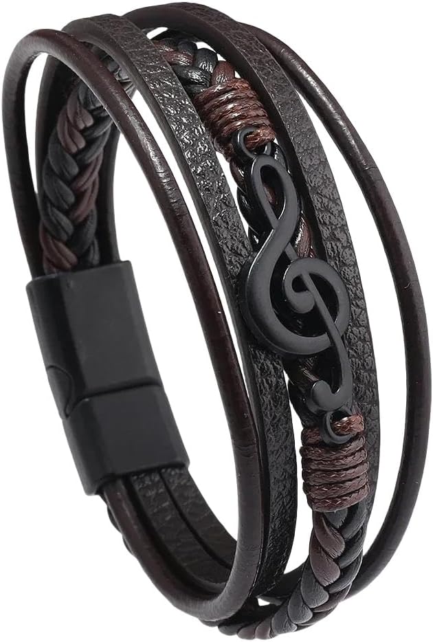 Men’s Leather Bracelet – Personalized Black Music Note, Multi-Layer Braided, Brown, Gift for Dad, Boyfriend, Husband