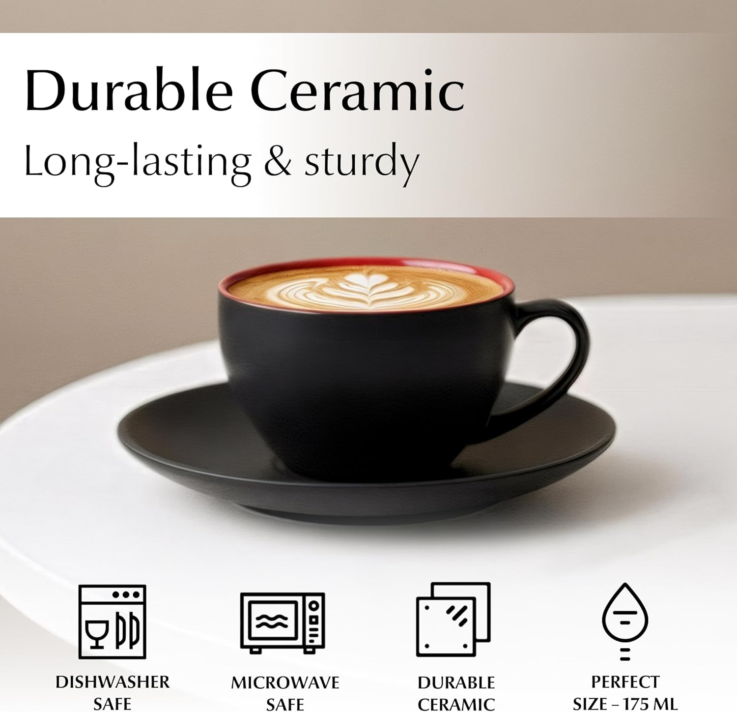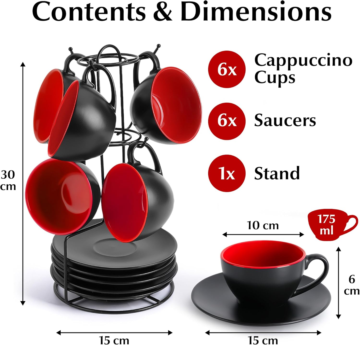 𝐇𝐈𝐆𝐇 𝐐𝐔𝐀𝐋𝐈𝐓𝐘 – The high-quality workmanship of stoneware makes the colors of the cappuccino cups particularly stand out. The high resistance of our ceramic mugs to wear and tear guarantees you a lifetime of the highest quality. Also included in the set are 6 black premium coasters for the coffee/tea cups.
