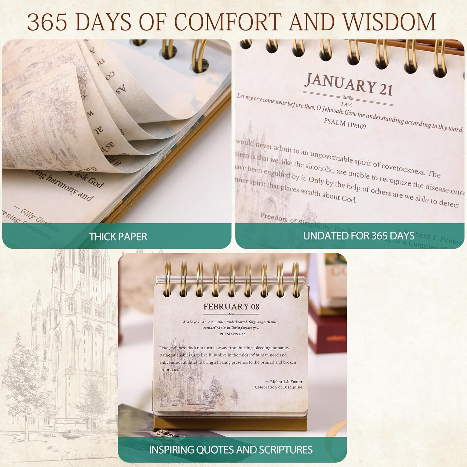 Text reads '365 DAYS OF COMFORT AND WISDOM'. Daily inspirational calendar with spiral binding shown in multiple views, featuring January page and soft beige tones.Text reads '365 DAYS OF COMFORT AND WISDOM'. Daily inspirational calendar with spiral binding shown in multiple views, featuring January page and soft beige tones.