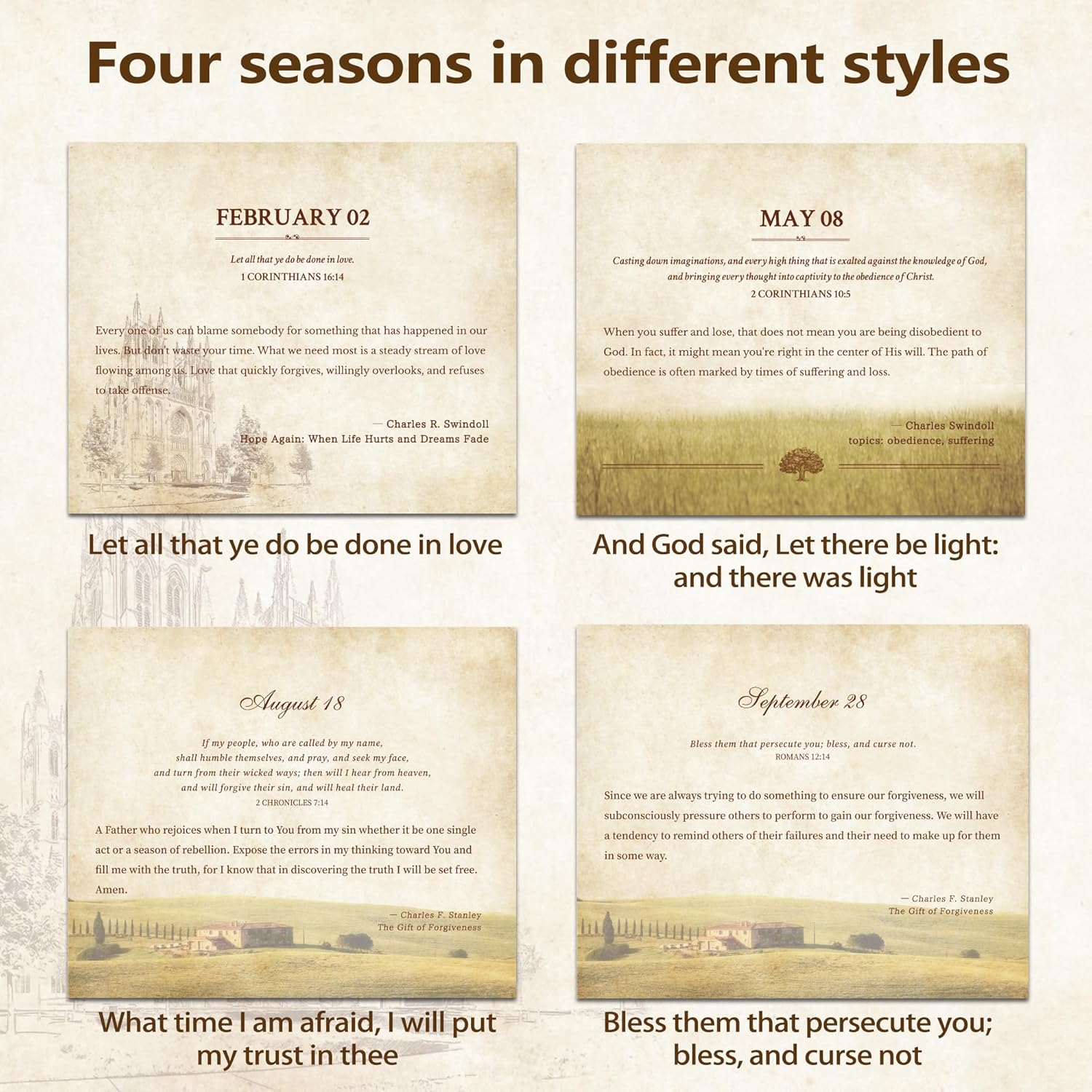 Text reads 'Four seasons in different styles'. Collection of four vintage-style biblical quotes including verses from February, May, August, and September with decorative backgrounds.Text reads 'Four seasons in different styles'. Collection of four vintage-style biblical quotes including verses from February, May, August, and September with decorative backgrounds.