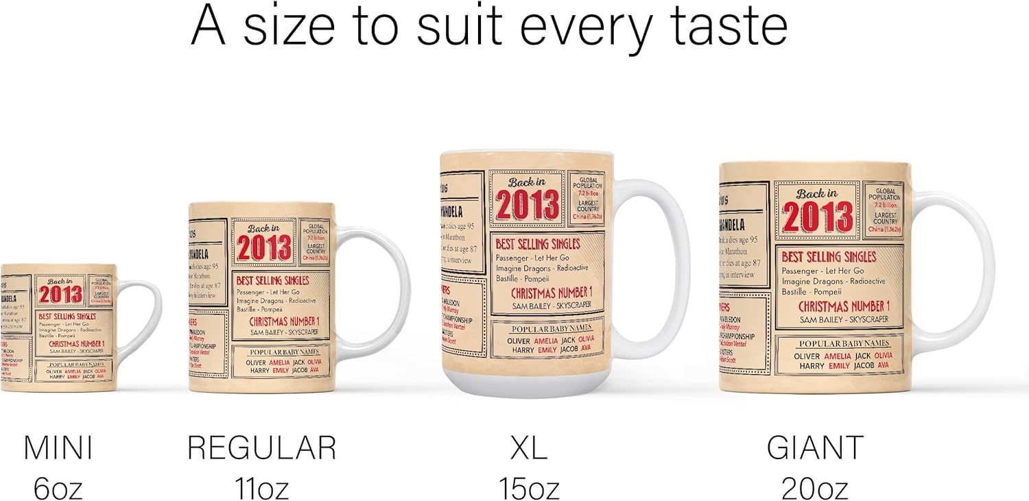 Celebrate 13 years with our ‘Back in 2013’ 13th birthday mug – A nostalgic journey through the past. Make a 13th birthday truly special with our ‘Back in 2013’ birthday mug. This unique gift is not just a mug; it’s a journey through time. Packed with fascinating infographics and information about the year 2013, it’s the perfect way to celebrate 13 years of life. Reaching 13 years is an incredible milestone, and our ‘Back in 2013’ birthday mug acknowledges this achievement in a meaningful way. It’s not just a mug; it’s a tribute to a life well-lived. The mug takes the recipient on a nostalgic journey back to 2013. It’s filled with infographics that highlight important events, fun facts, and historical milestones from that year. From significant news stories to pop culture moments, this mug provides a snapshot of what life was like in 2013. Crafted with care, our ‘Back in 2013’ birthday mug is made from high-quality materials, ensuring a polished and professional finish. The attention to detail in the infographics and design makes it a standout choice for celebrating a 13th birthday.valentines day, mother’s day or father’s day. No matter the occasion, no matter the recipient, be it your mom, dad, son, daughter, husband, wife, friend or an office colleague, you can be safe in the knowledge our ceramic mugs will not let you down. They are 100% dishwasher safe and microwave safe (microwaveable). We have the best range of novelty, funny and on-trend merchandise for any occason. Many of our mugs are customisable, making them the perfect personalised gift for men or women. Available as a white mug or black mug, and in a range of sizes from mini mug (perfect for children and toddlers) up to extra large and giant size mugs (a.k.a. jumbo mugs), they really are the best gift idea for any member of the family.Capacities: