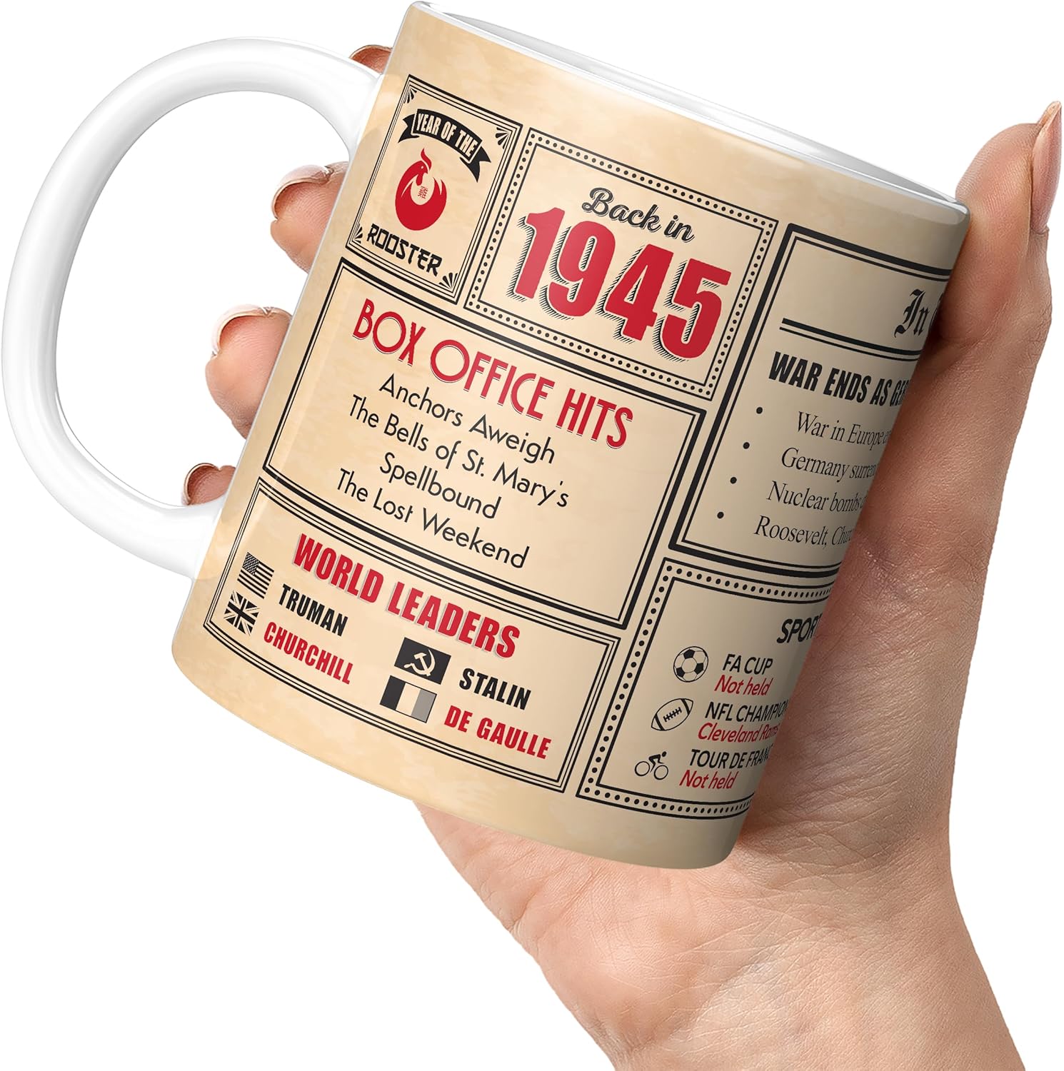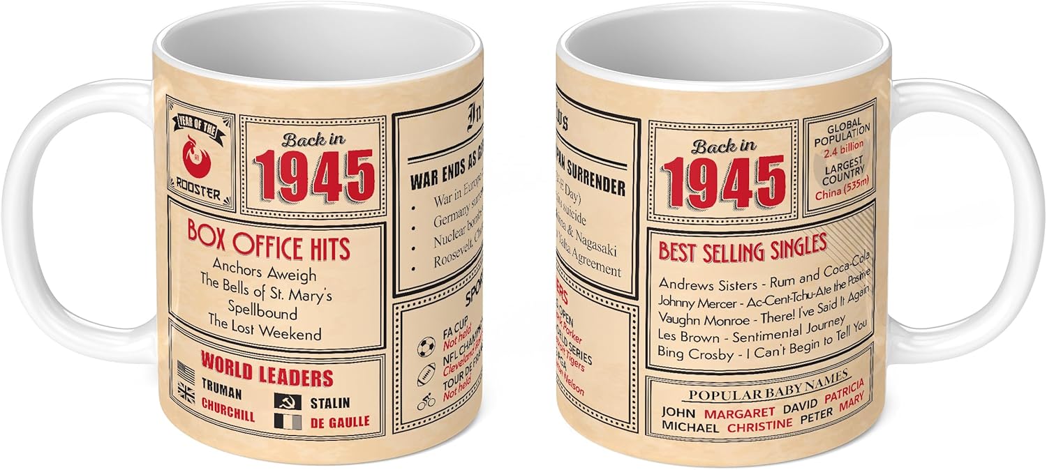 Celebrate 81 years with our ‘Back in 1945’ 81st birthday mug – A nostalgic journey through the past. Make a 81st birthday truly special with our ‘Back in 1945’ birthday mug. This unique gift is not just a mug; it’s a journey through time. Packed with fascinating infographics and information about the year 1945, it’s the perfect way to celebrate 81 years of life. Reaching 81 years is an incredible milestone, and our ‘Back in 1945’ birthday mug acknowledges this achievement in a meaningful way. It’s not just a mug; it’s a tribute to a life well-lived. The mug takes the recipient on a nostalgic journey back to 1945. It’s filled with infographics that highlight important events, fun facts, and historical milestones from that year. From significant news stories to pop culture moments, this mug provides a snapshot of what life was like in 1945. Crafted with care, our ‘Back in 1945’ birthday mug is made from high-quality materials, ensuring a polished and professional finish. The attention to detail in the infographics and design makes it a standout choice for celebrating a 81st birthday.valentines day, mother’s day or father’s day. No matter the occasion, no matter the recipient, be it your mom, dad, son, daughter, husband, wife, friend or an office colleague, you can be safe in the knowledge our ceramic mugs will not let you down. They are 100% dishwasher safe and microwave safe (microwaveable). We have the best range of novelty, funny and on-trend merchandise for any occason. Many of our mugs are customisable, making them the perfect personalised gift for men or women. Available as a white mug or black mug, and in a range of sizes from mini mug (perfect for children and toddlers) up to extra large and giant size mugs (a.k.a. jumbo mugs), they really are the best gift idea for any member of the family.Capacities: