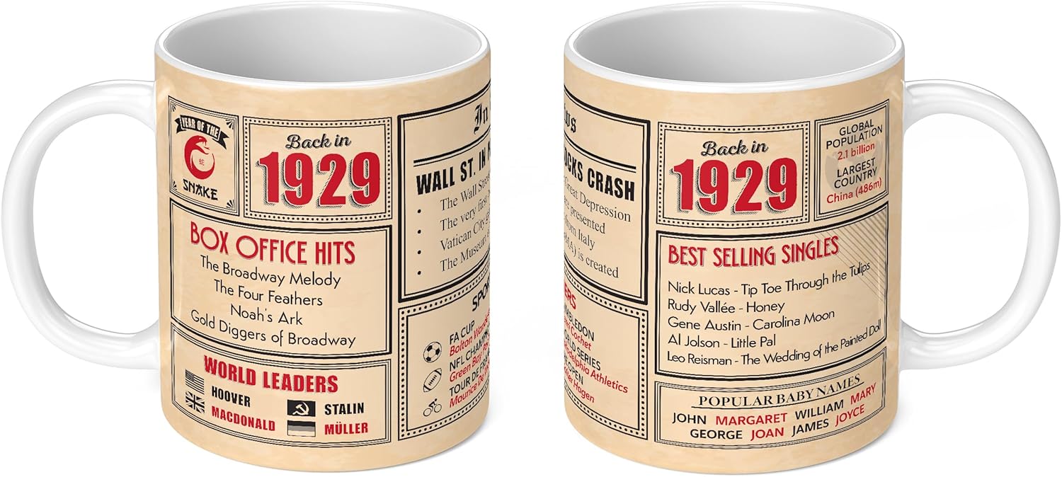 Celebrate 97 years with our ‘Back in 1929’ 97th birthday mug – A nostalgic journey through the past. Make a 97th birthday truly special with our ‘Back in 1929’ birthday mug. This unique gift is not just a mug; it’s a journey through time. Packed with fascinating infographics and information about the year 1929, it’s the perfect way to celebrate 97 years of life. Reaching 97 years is an incredible milestone, and our ‘Back in 1929’ birthday mug acknowledges this achievement in a meaningful way. It’s not just a mug; it’s a tribute to a life well-lived. The mug takes the recipient on a nostalgic journey back to 1929. It’s filled with infographics that highlight important events, fun facts, and historical milestones from that year. From significant news stories to pop culture moments, this mug provides a snapshot of what life was like in 1929. Crafted with care, our ‘Back in 1929’ birthday mug is made from high-quality materials, ensuring a polished and professional finish. The attention to detail in the infographics and design makes it a standout choice for celebrating a 97th birthday.valentines day, mother’s day or father’s day. No matter the occasion, no matter the recipient, be it your mom, dad, son, daughter, husband, wife, friend or an office colleague, you can be safe in the knowledge our ceramic mugs will not let you down. They are 100% dishwasher safe and microwave safe (microwaveable). We have the best range of novelty, funny and on-trend merchandise for any occason. Many of our mugs are customisable, making them the perfect personalised gift for men or women. Available as a white mug or black mug, and in a range of sizes from mini mug (perfect for children and toddlers) up to extra large and giant size mugs (a.k.a. jumbo mugs), they really are the best gift idea for any member of the family.Capacities: