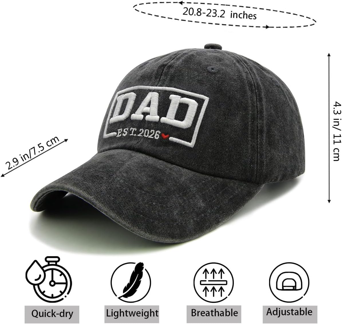 Celebrate the newest dad in your life with this “New Dad Est 2026” baseball cap—a perfect first-time father gift! Designed for comfort with an adjustable metal buckle, this breathable cotton hat fits most head sizes. The stylish embroidered “Dad Est 2026” design proudly announces his new role—great for baby showers, Father’s Day, birthdays, or pregnancy announcements. A thoughtful gift for husbands, brothers, or friends stepping into fatherhood. Lightweight, soft, and machine-washable for everyday wear. Make his journey into dad life extra special! Why choose this? ✔ Adjustable & comfortable ✔ Raise embroidery ✔ Ideal for new dads & dad-to-be ✔ Unisex design for any occasion Perfect for: First-time dads, Father’s Day, baby reveal gifts, and more!