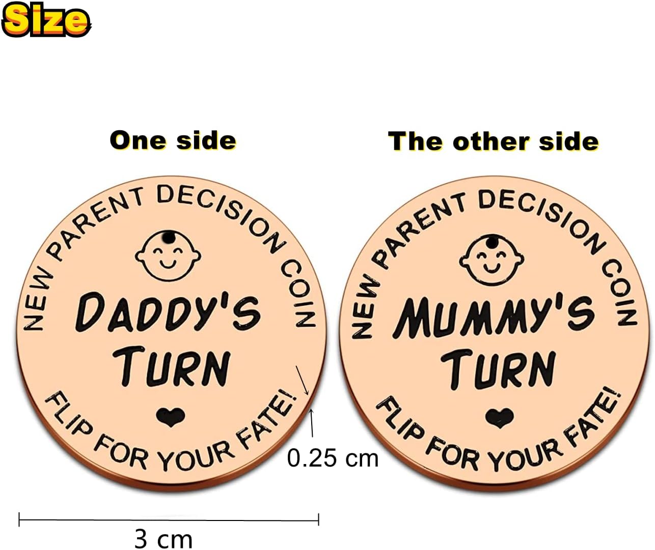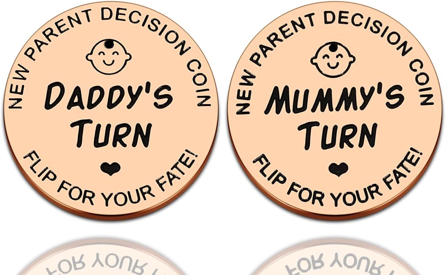 👶【Cute design】👶:Our decision coins made of high-quality Stainless Steel,Will not rust and fade.3cm in diameter and weighs just 10g and you can carry it everywhere.Two sided print with Daddy’s turn on one side and Mummy’s turn on the reverse.