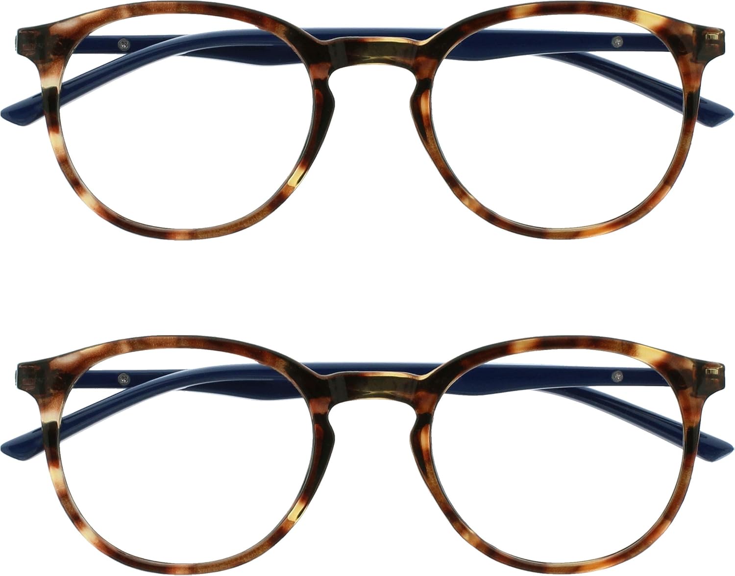 Two pairs of stylish blue light blocking computer / gaming glasses with transparent lens. Large size. Men’s / women’s / unisex. Protect your eyes from HEV and UV400 rays. Relieve eyestrain when using your computer, mobile, tablet or while gaming. See comfortably during exposure to LED or fluorescent lighting. Sturdy round frame design with spring hinges. Easy to clean. Scratch-resistant. Comfort fit. Includes FREE designer style pouch. Brown tortoiseshell front with navy blue arms. Zero magnification.