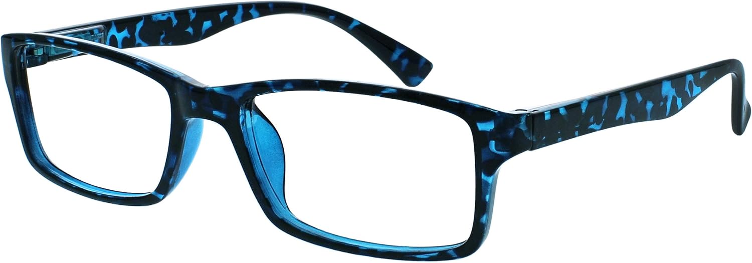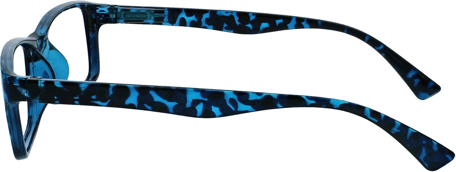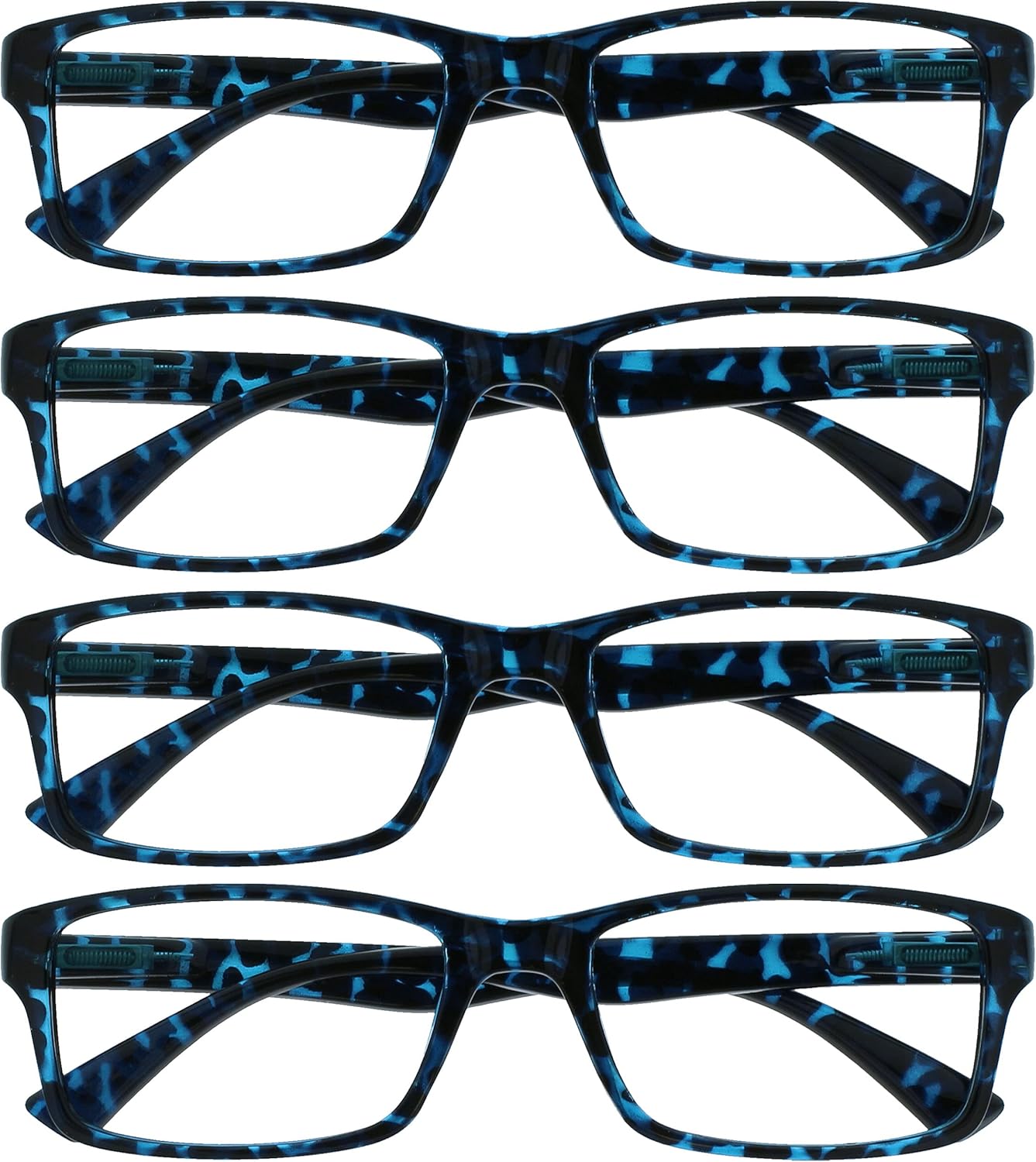 Four pairs of stylish mens/womens/unisex ‘Designer’ style reading glasses. For indoors/normal reading conditions. Sturdy frame design with quality hinges. Blue tortoiseshell finish. Strength +1.50.