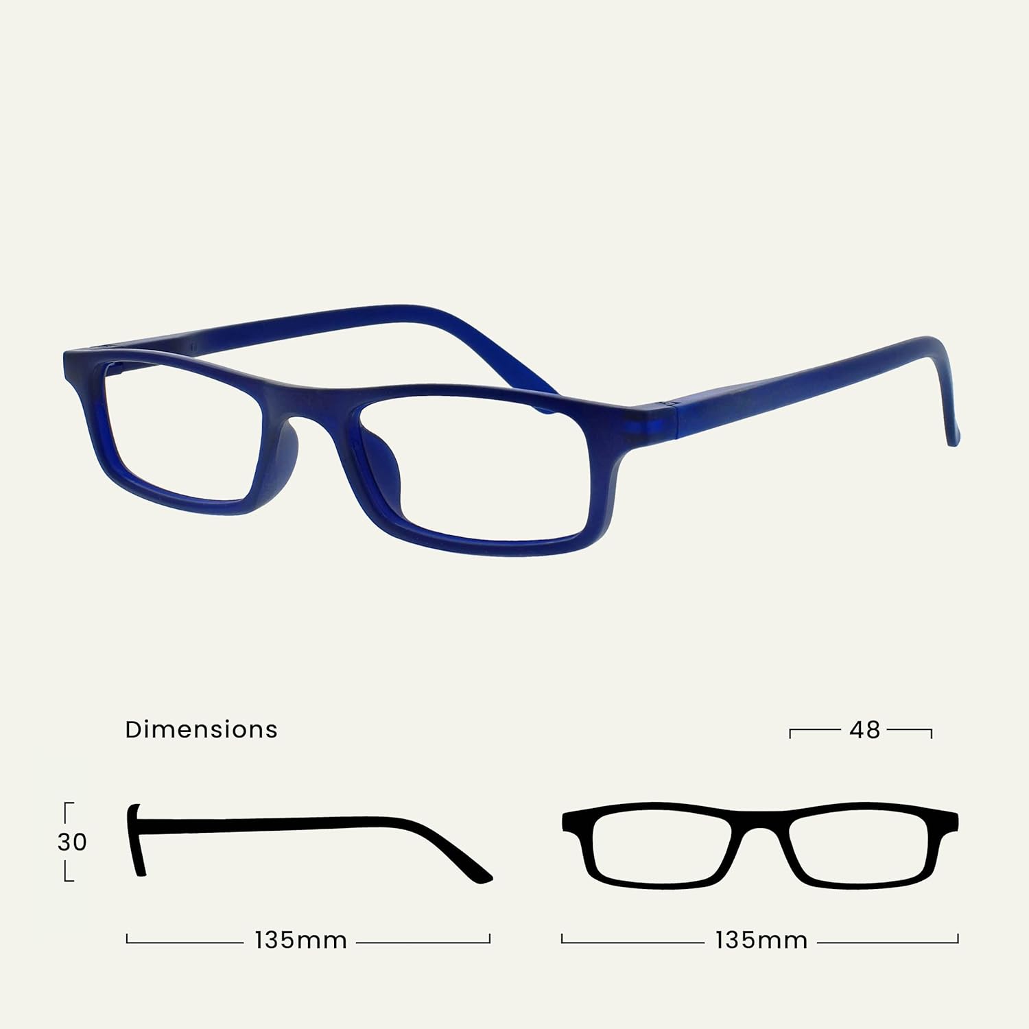 Lightweight mens/womens/unisex ‘Designer’ style reading glasses. For indoors/normal reading conditions. Sturdy frame design with spring hinges. Matt navy blue finish. Strength +3.50.