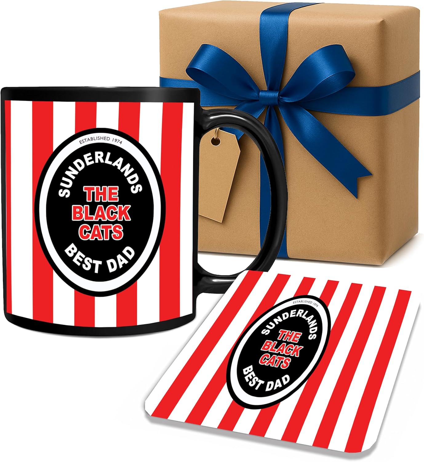 Personalised Football Gift – Best Dad Mug and Coaster Set – Custom Team Colours Coffee Cup with Matching Coaster – Father’s Day, Birthday or Gift for Dad (Sunderland)