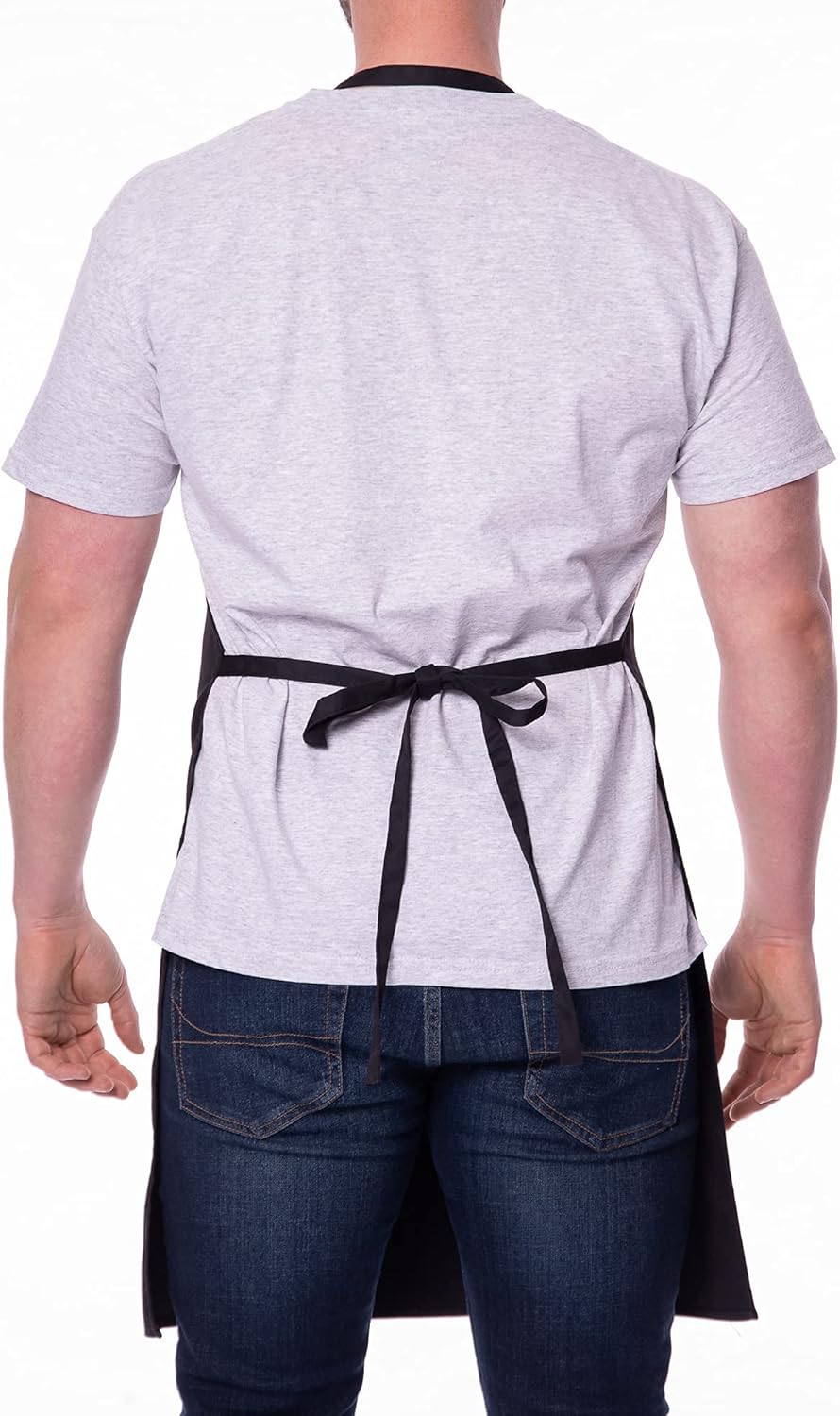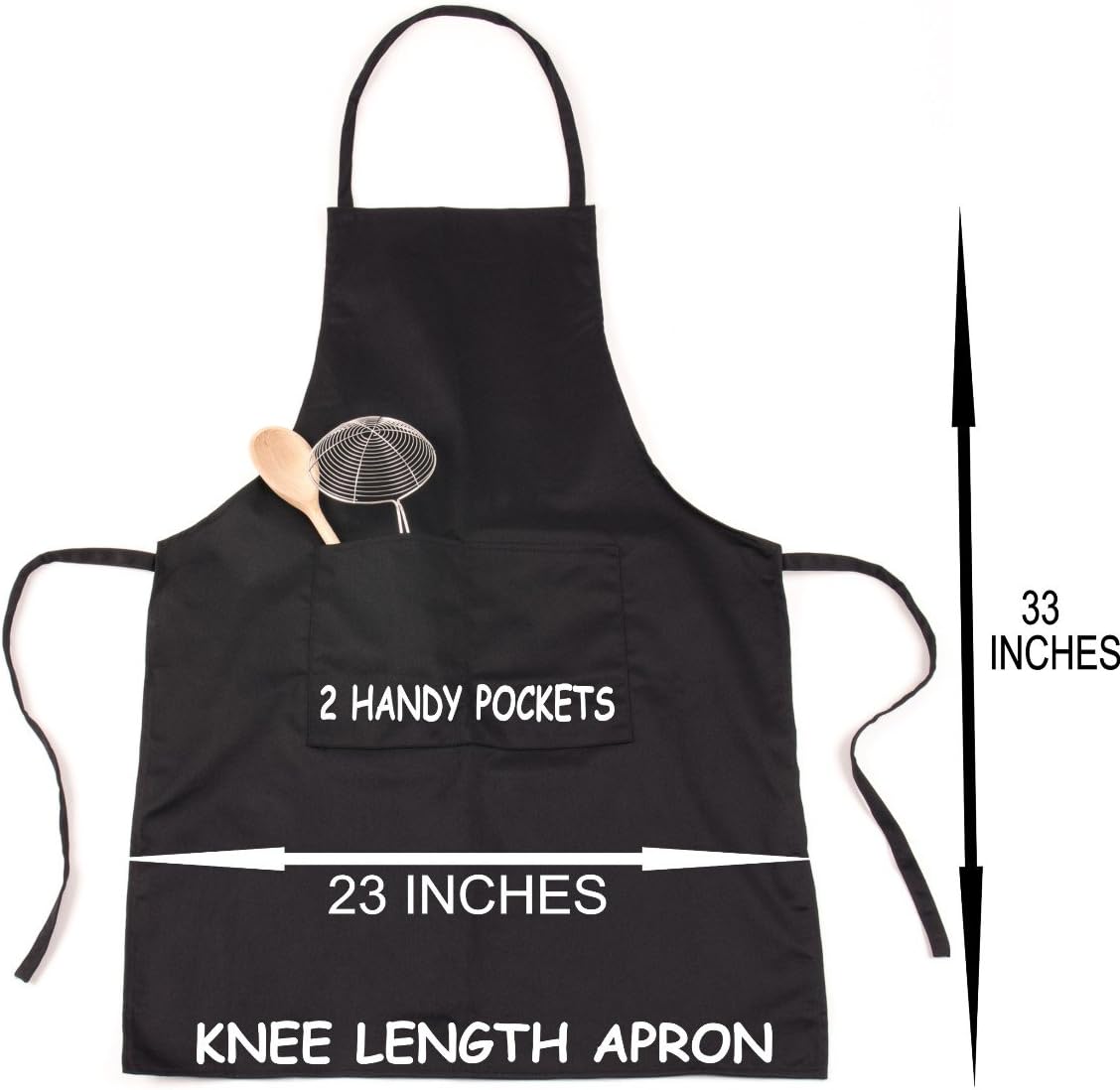 Measures 23 inches in width and 33 inches top to bottom.Ties at the back, wide neck loop and knee length on average height adultDouble pocket on the front, great for keeping cooking utensils to hand