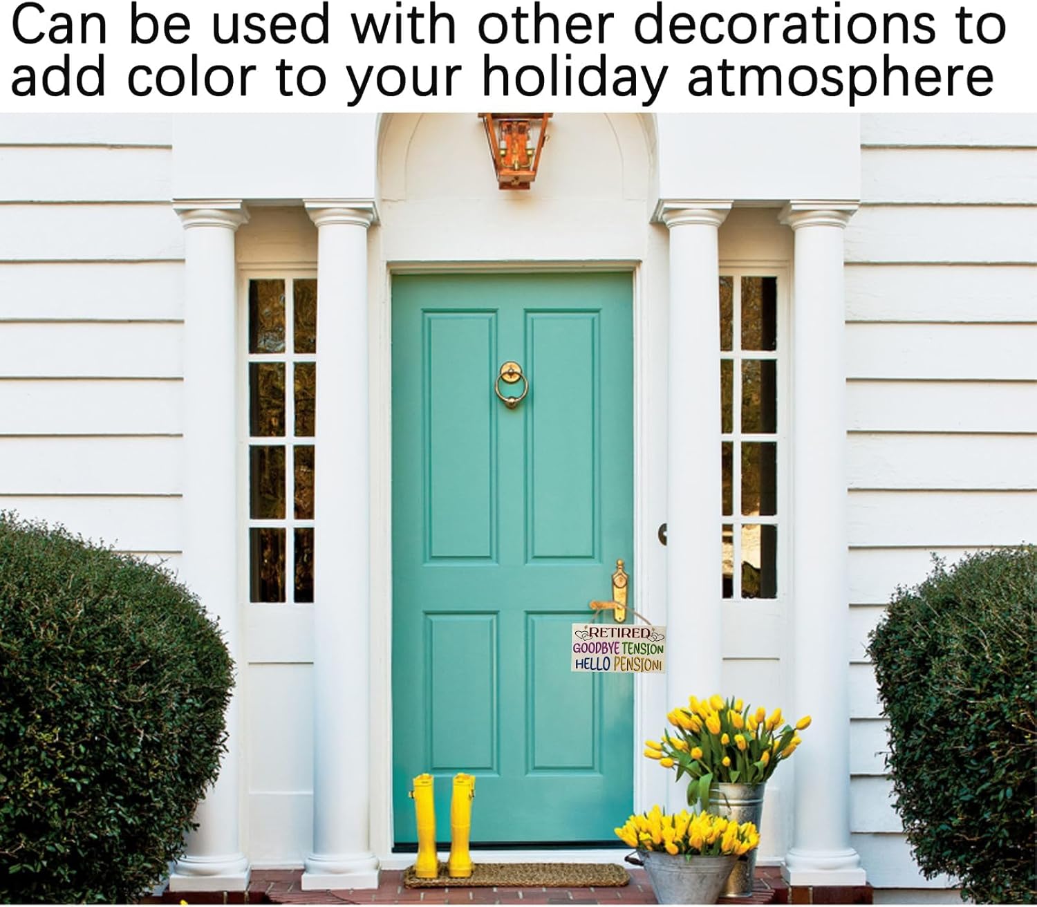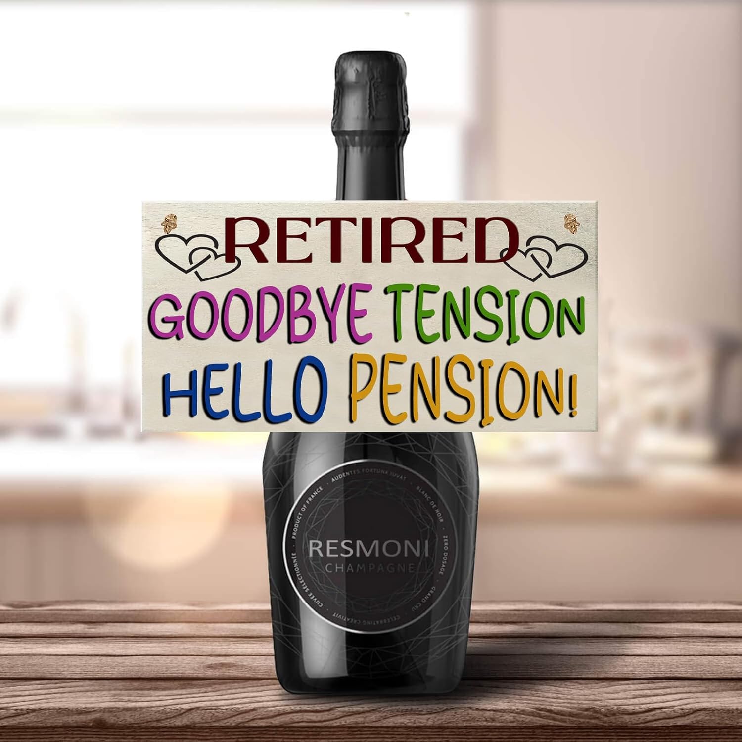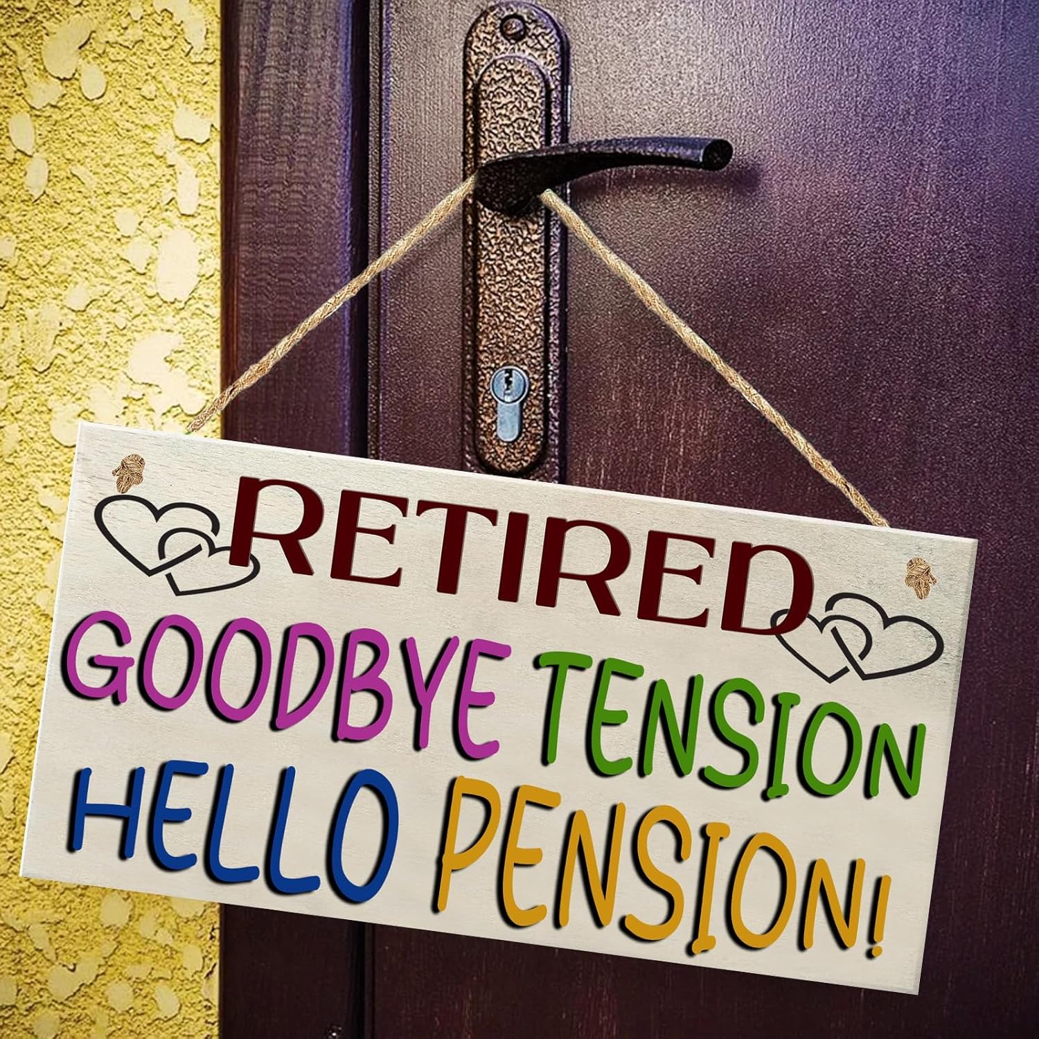 Wooden sign hanging on door handle. Text reads 'Retired: Goodbye Tension, Hello Pension!' in colorful letters.Wooden sign hanging on door handle. Text reads 'Retired: Goodbye Tension, Hello Pension!' in colorful letters.