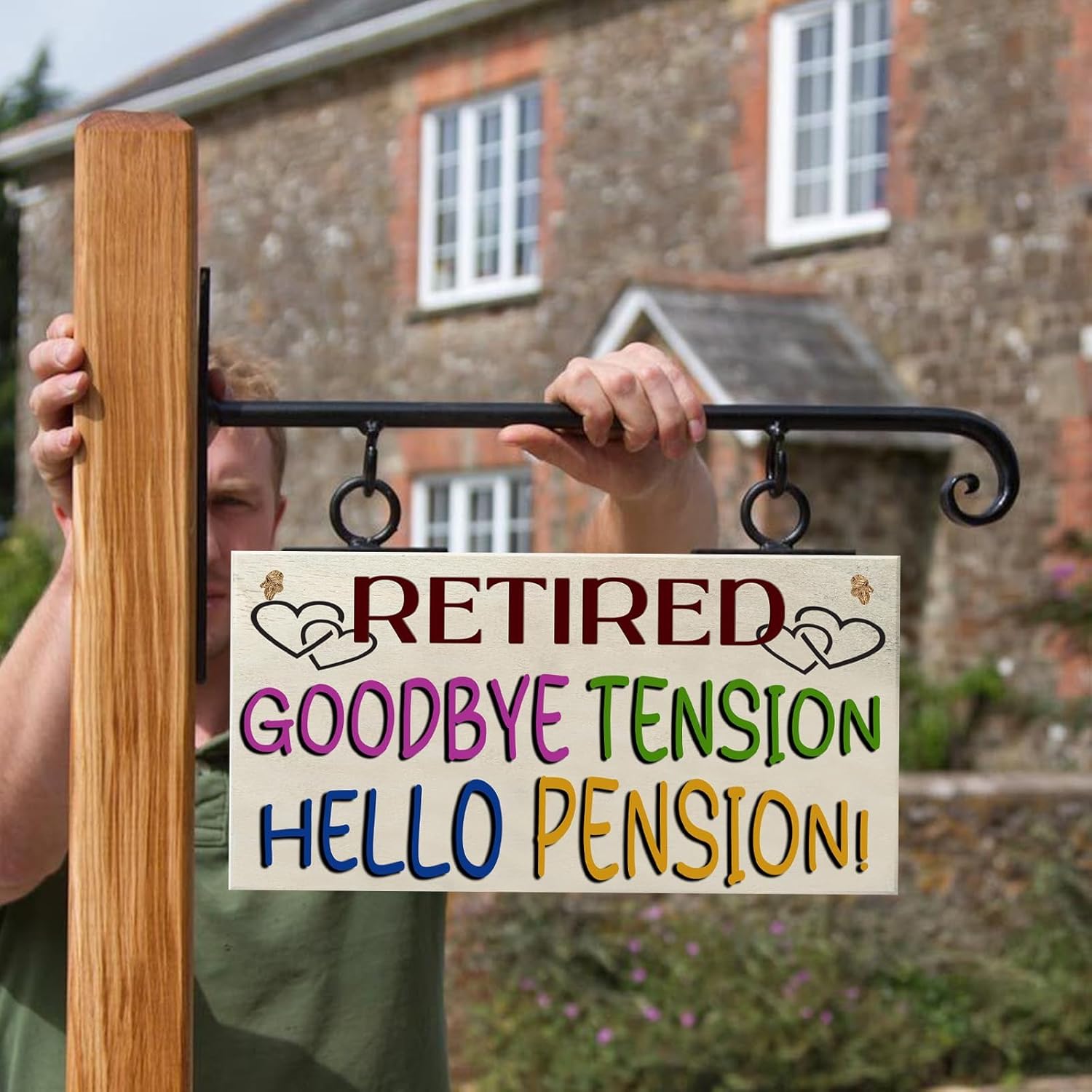 Wooden post with hanging sign reading 'RETIRED: GOODBYE TENSION HELLO PENSION!' in colorful text. House visible in background.Wooden post with hanging sign reading 'RETIRED: GOODBYE TENSION HELLO PENSION!' in colorful text. House visible in background.