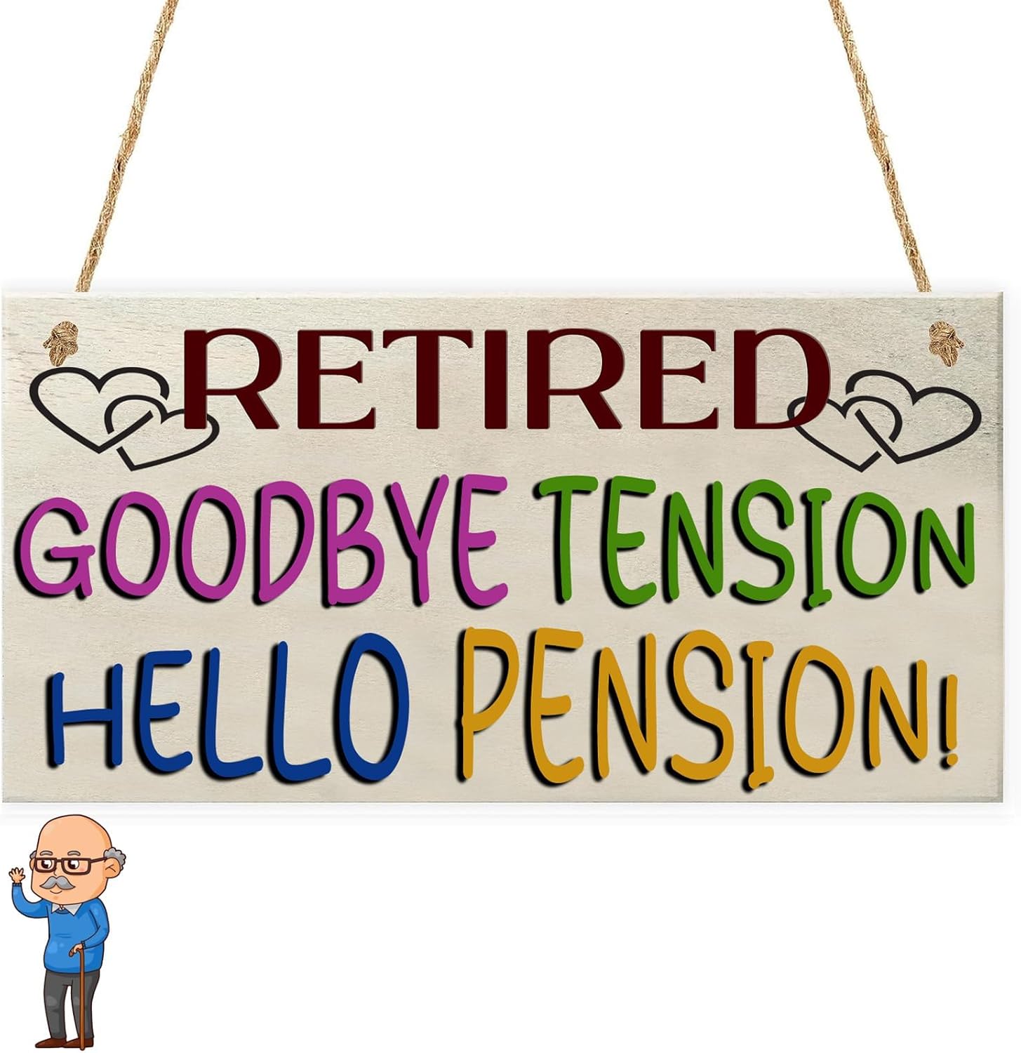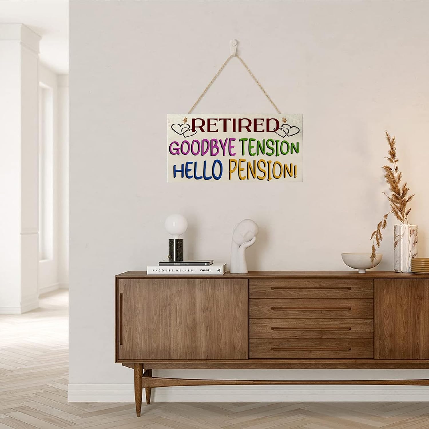 Colorful hanging wall sign with text 'RETIRED GOODBYE TENSION HELLO PENSION!' above wooden sideboard with decorative items in a minimalist room setting.Colorful hanging wall sign with text 'RETIRED GOODBYE TENSION HELLO PENSION!' above wooden sideboard with decorative items in a minimalist room setting.