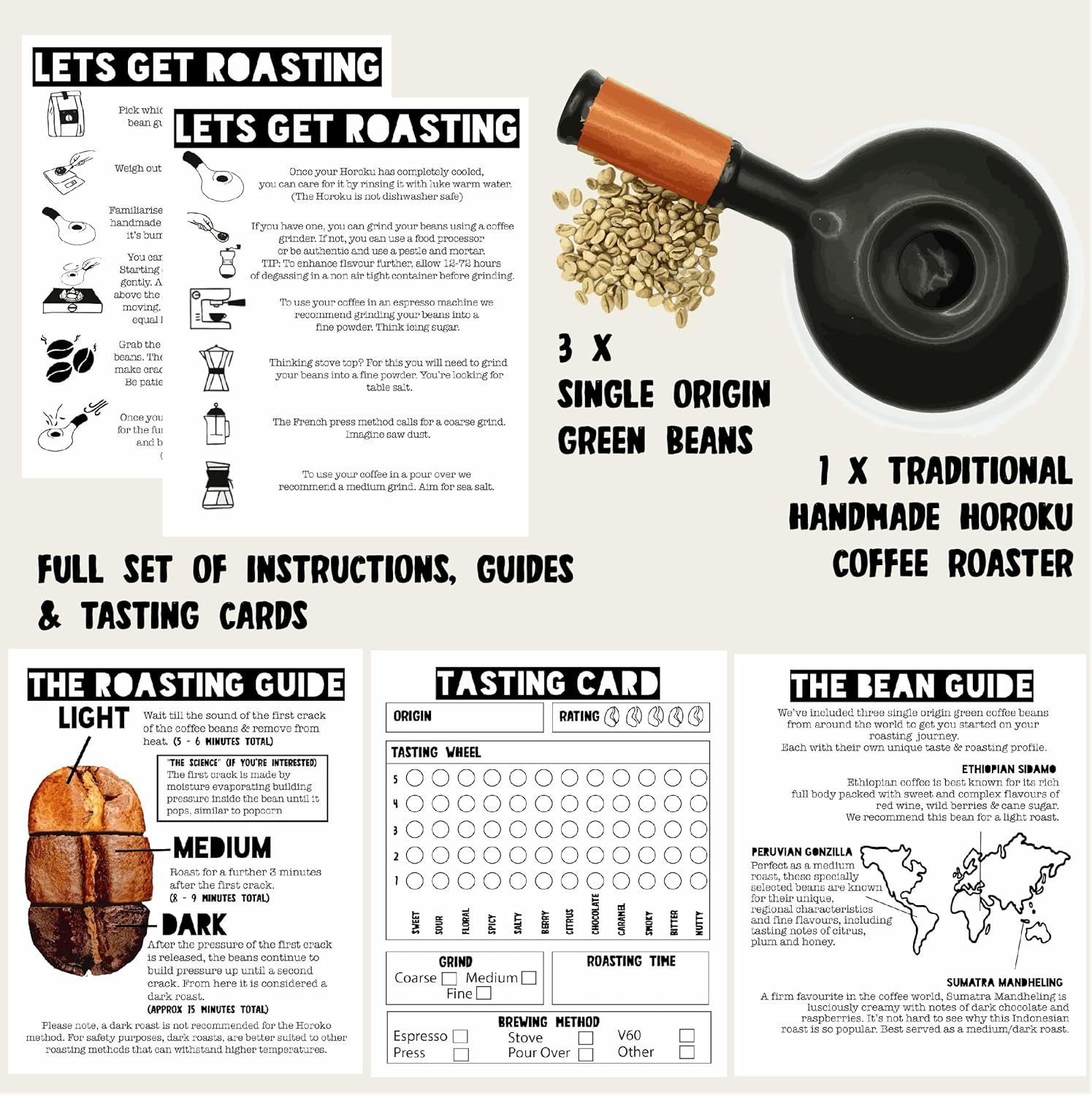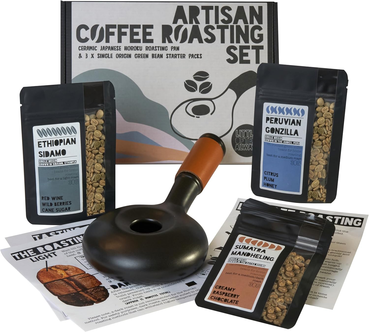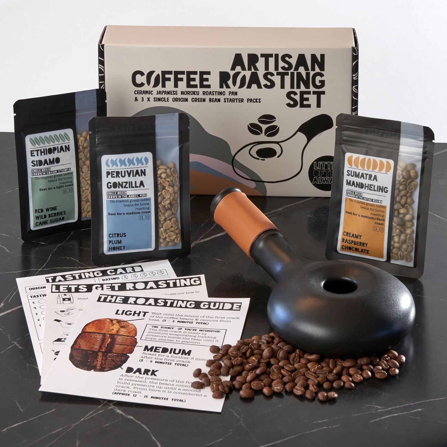 The set includes an artisan roasting pan, green coffee beans, and a how-to guide for roasting at light, medium, and dark levels.