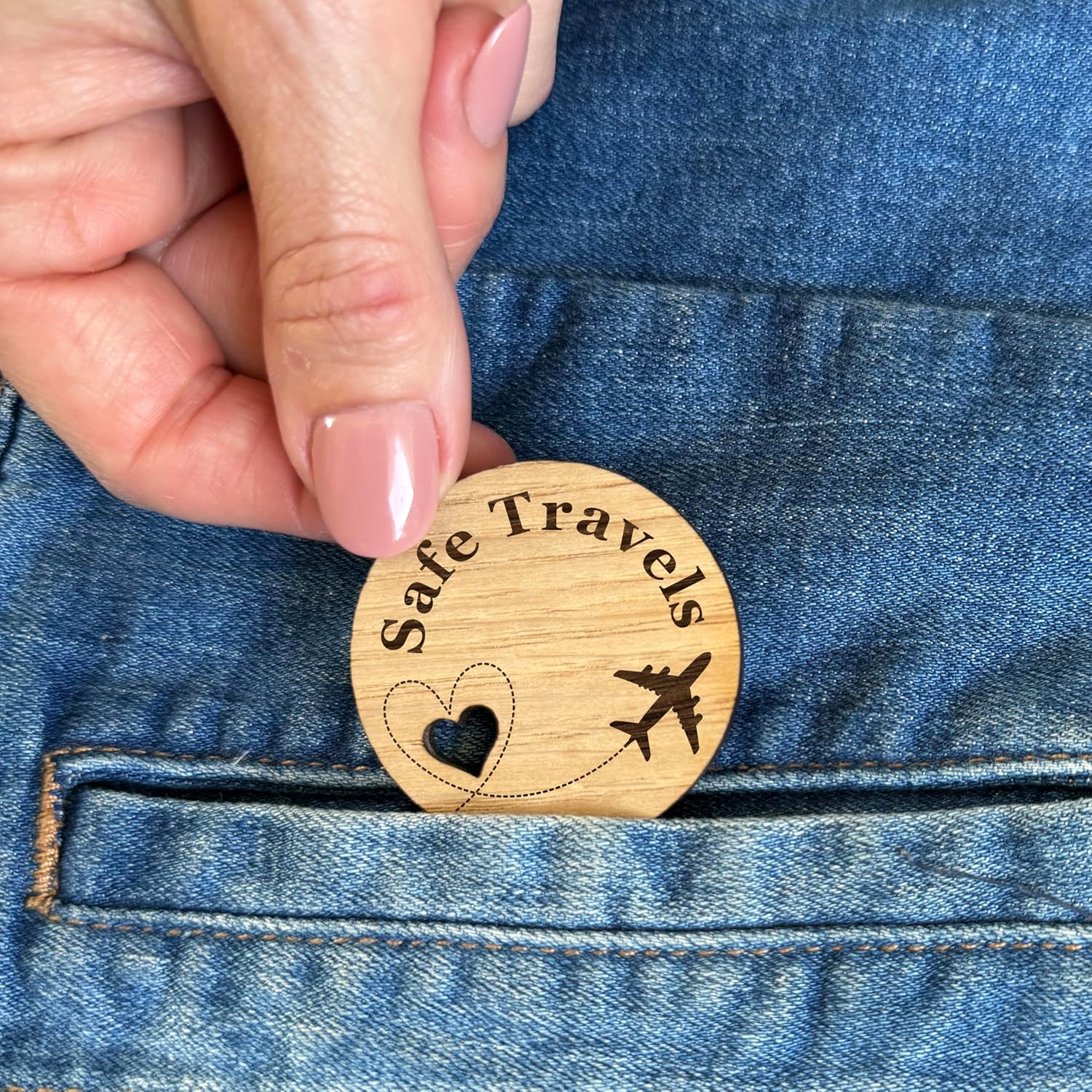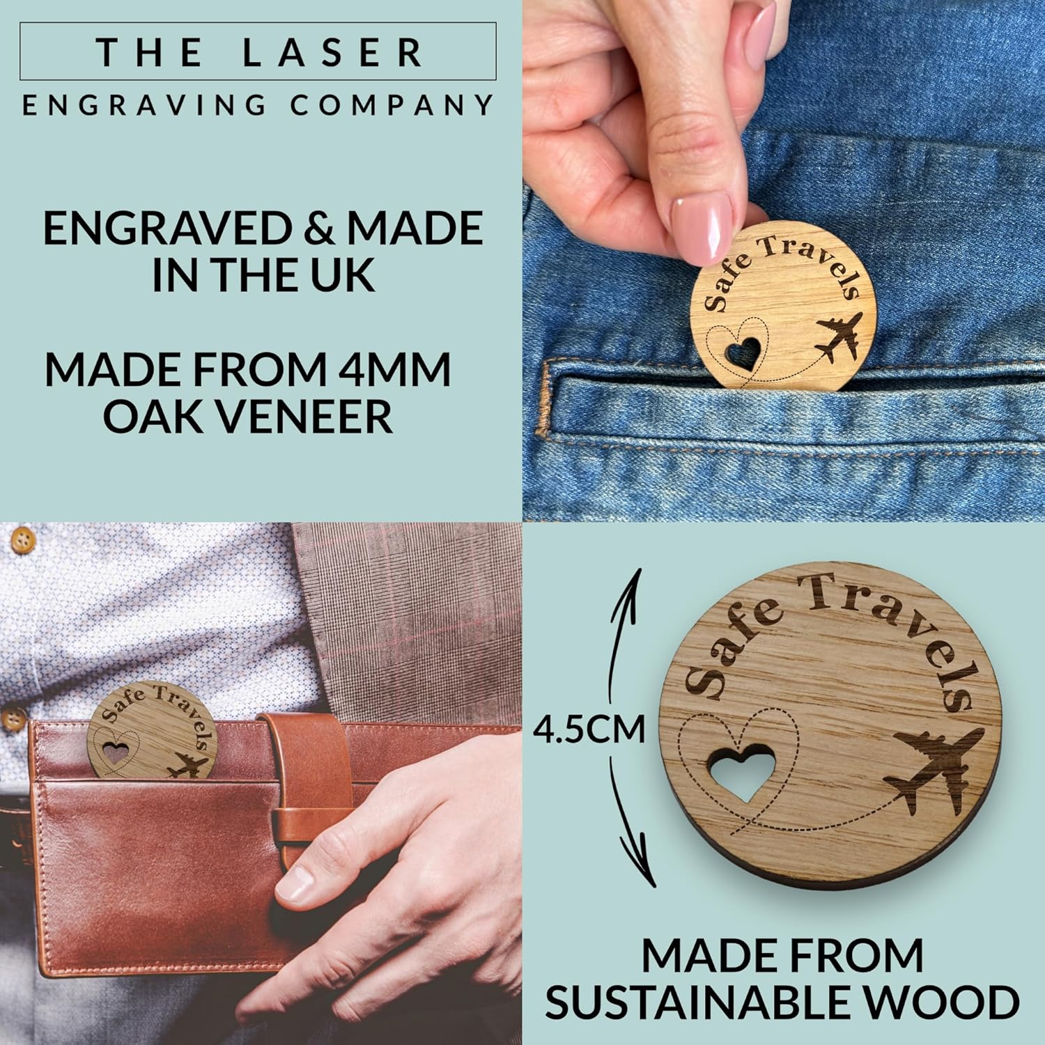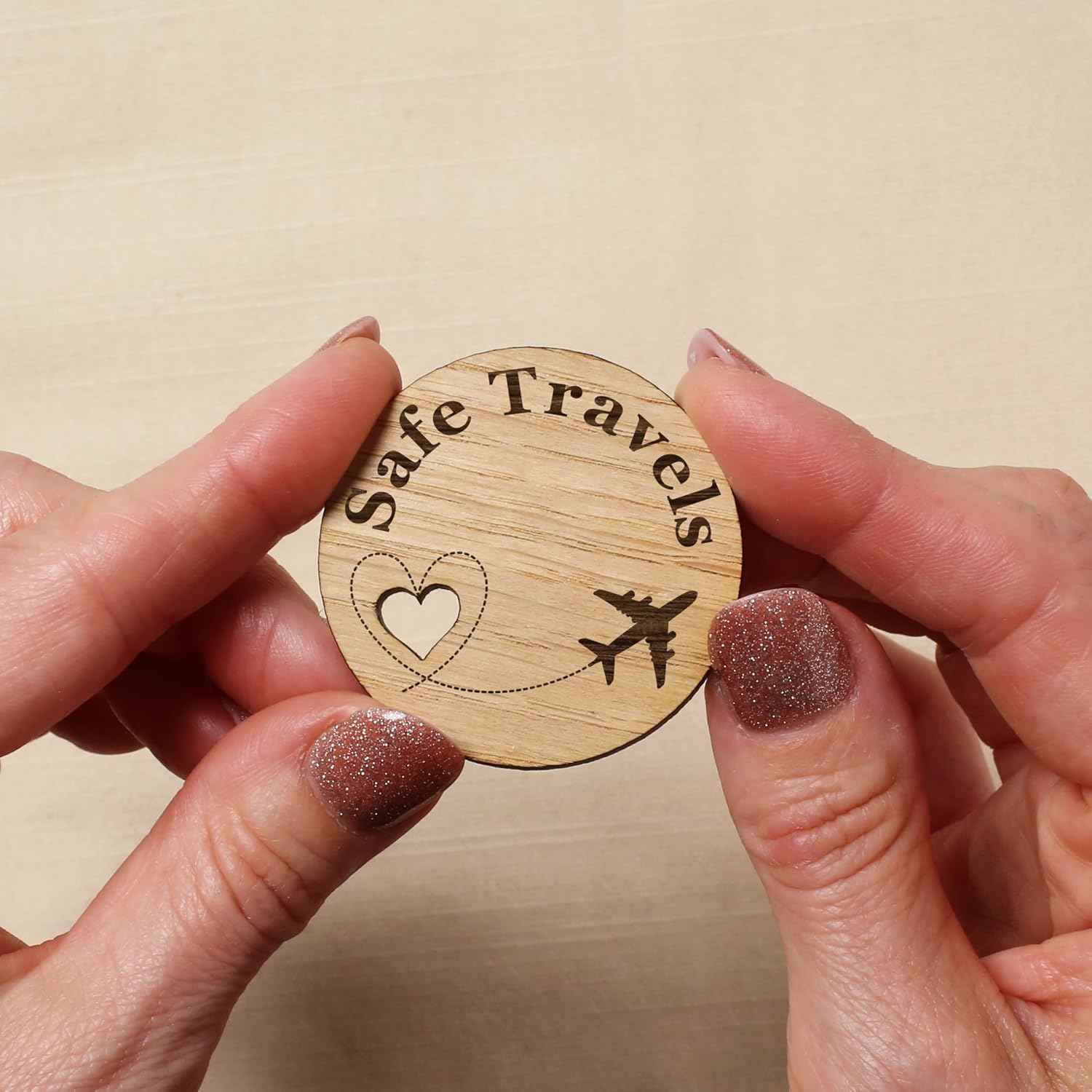 Size: This ‘Safe Travel Token, Pocket Holiday Hug Token, Gap Year Adventure Charm’ token hug is 4.5cm and is made from 4mm Oak Veneer.