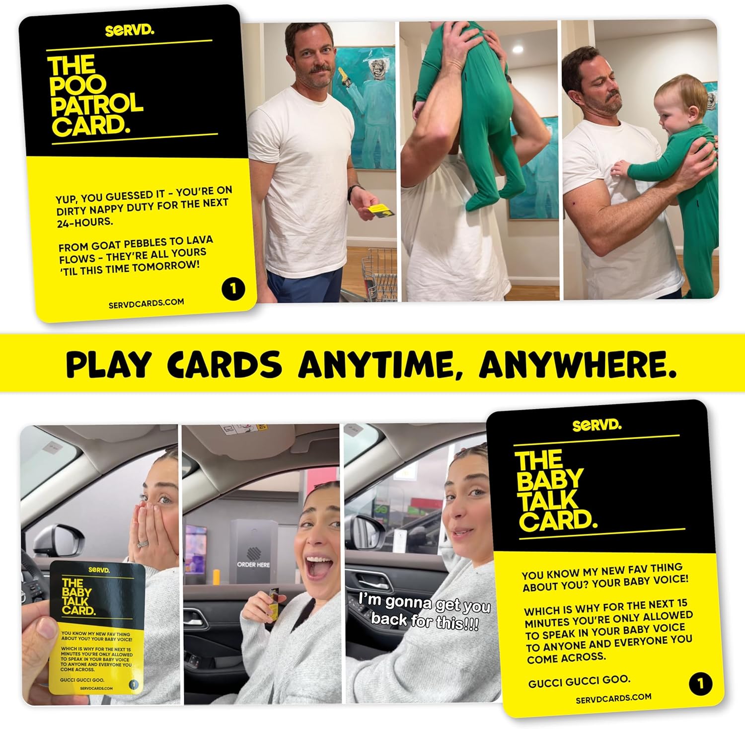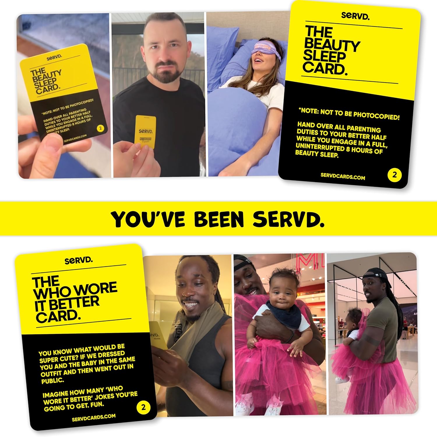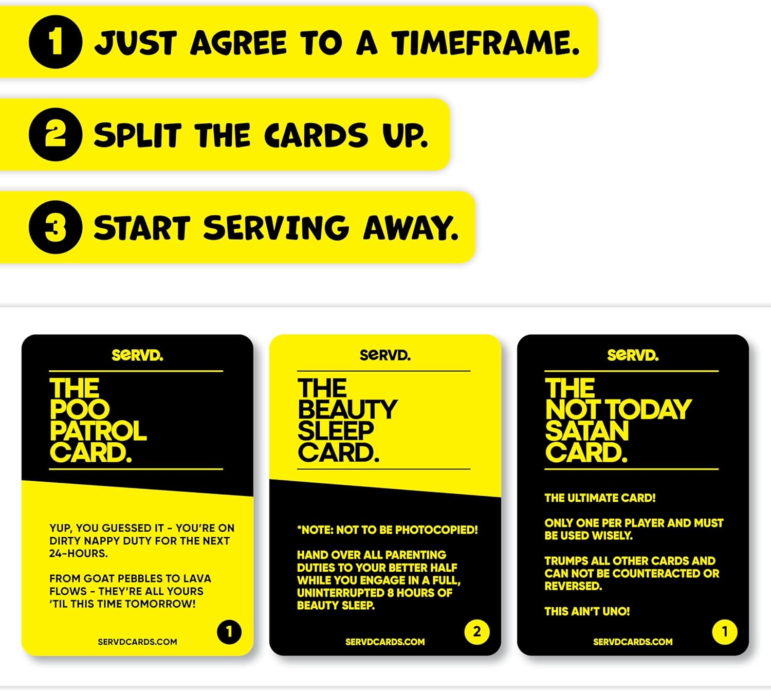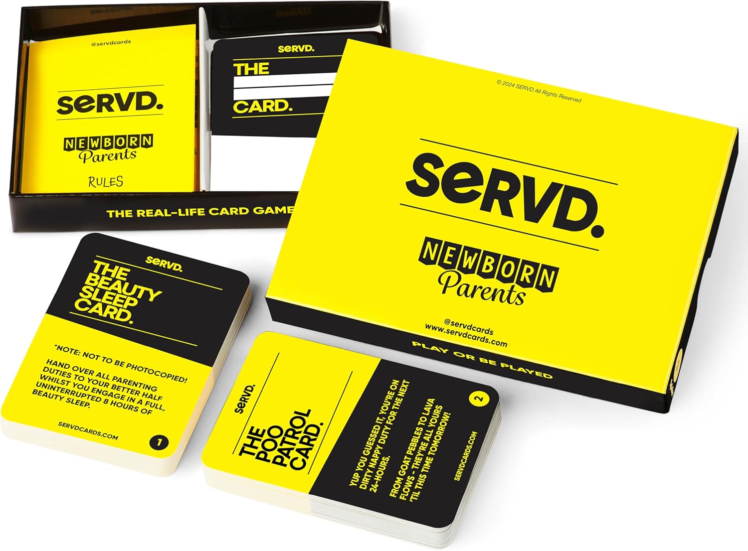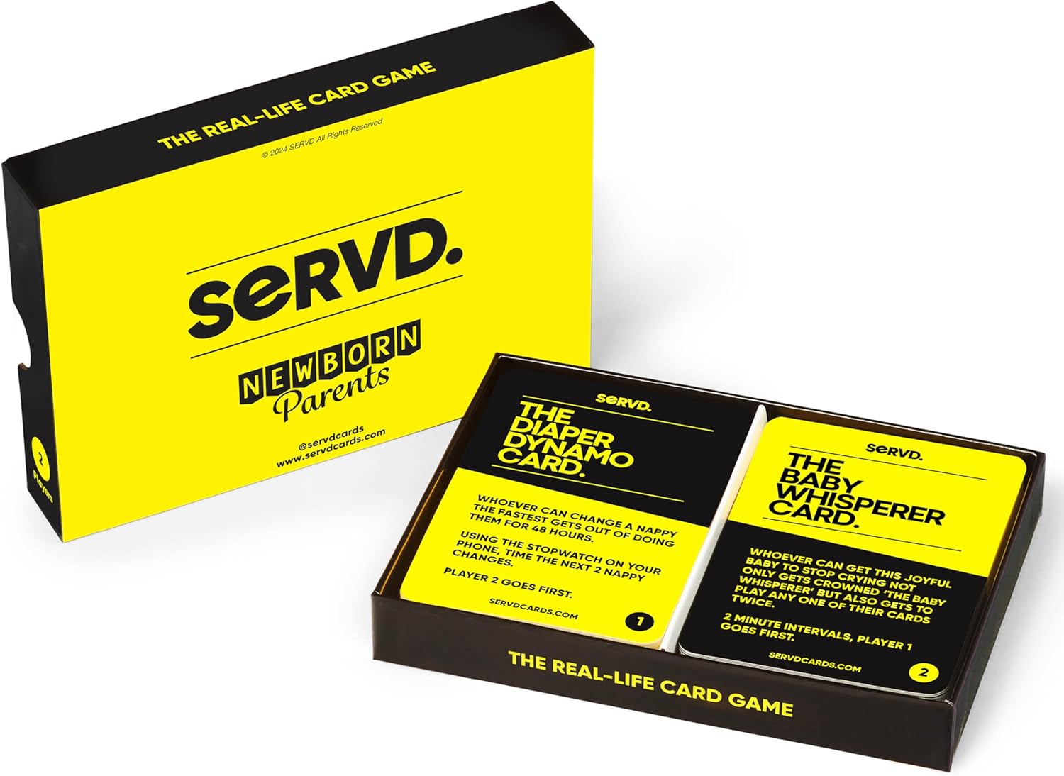 WHAT’S IN THE SERVD DECK? The SERVD Newborns deck includes 74 hilariously insightful cards that give each parent powers they could only dream of. Suitable for couples with a 0-3 year old. 2 players only.