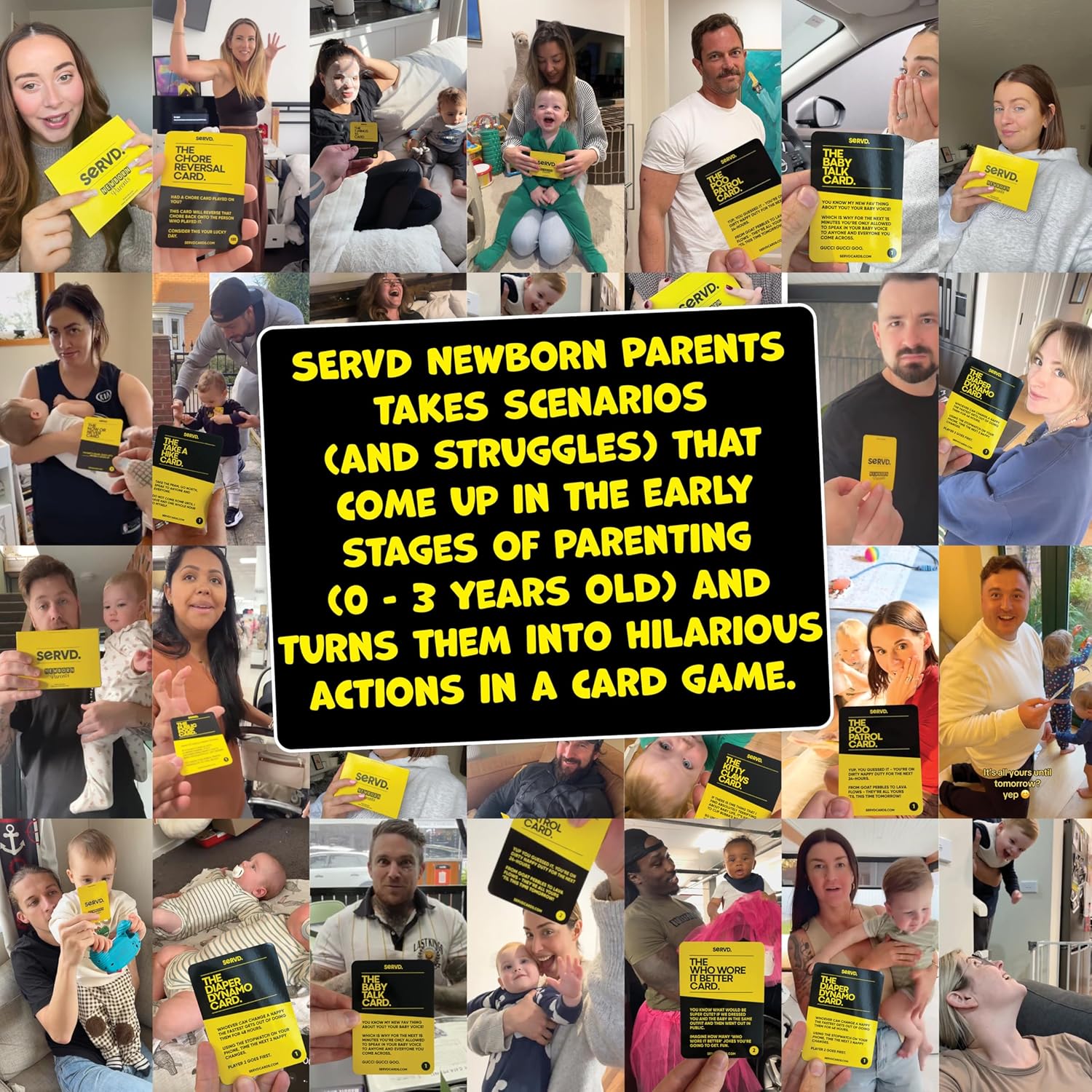 SERVD Newborns is an outrageously fun and insightful game designed for parents of newborns and infants (0-3 years old). Taking scenarios that come up in the early stages of parenting and turning them into hilarious actions in a card game.