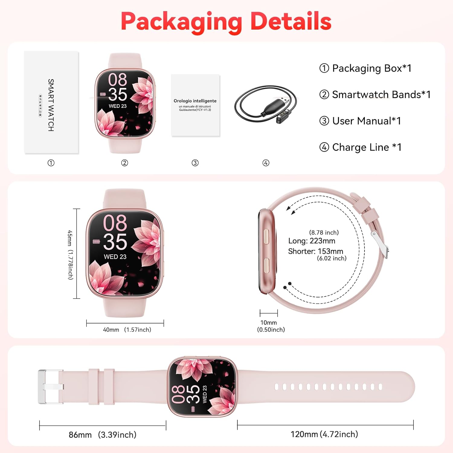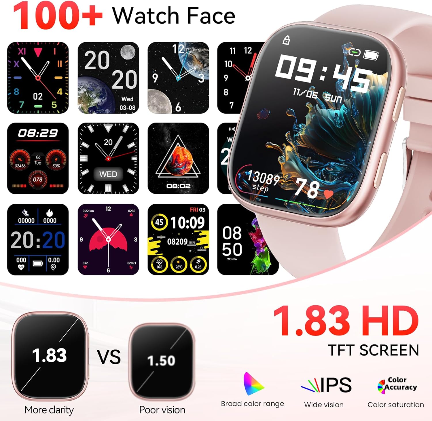 【1.83″ HD Display & Customizable Watch Faces】Smart watch Immerse yourself in a vibrant 1.83-inch TFT display, boasting a sharp resolution of 240*284 for crystal-clear visuals. Effortlessly personalize your smart watch with a wide array of customizable watch faces to suit your personal style for every occasion—whether trendy, artistic, or minimalist—ideal for casual, sporty, or professional. Its sleek, modern design complements any outfit, blending technology and fashion seamlessly for everyday wear.