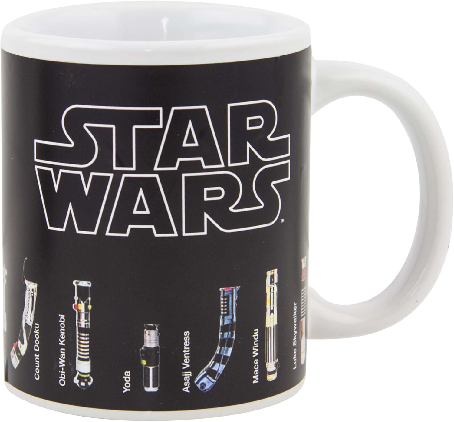HEAT ACTIVATED: This porcelain mug features a screen-printed, heat-activated decal with lightsabers from characters like Obi-Wan Kenobi, Yoda, Mace Windu, Darth Vader, and Luke Skywalker.