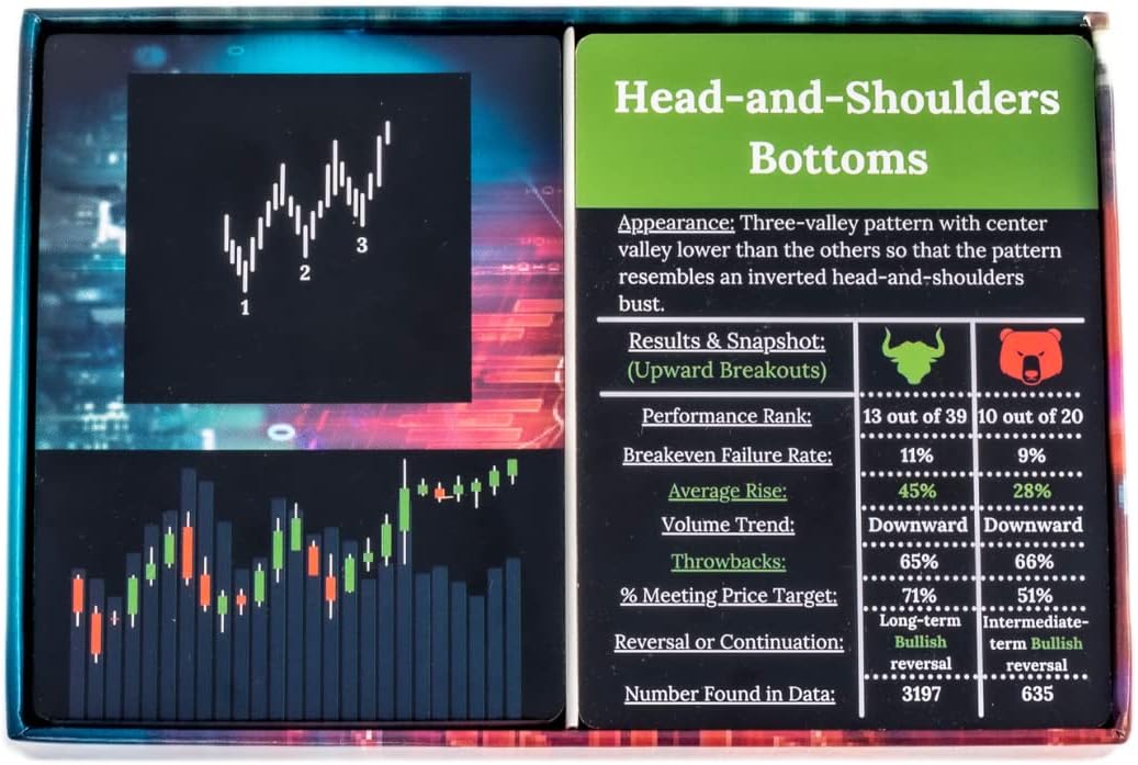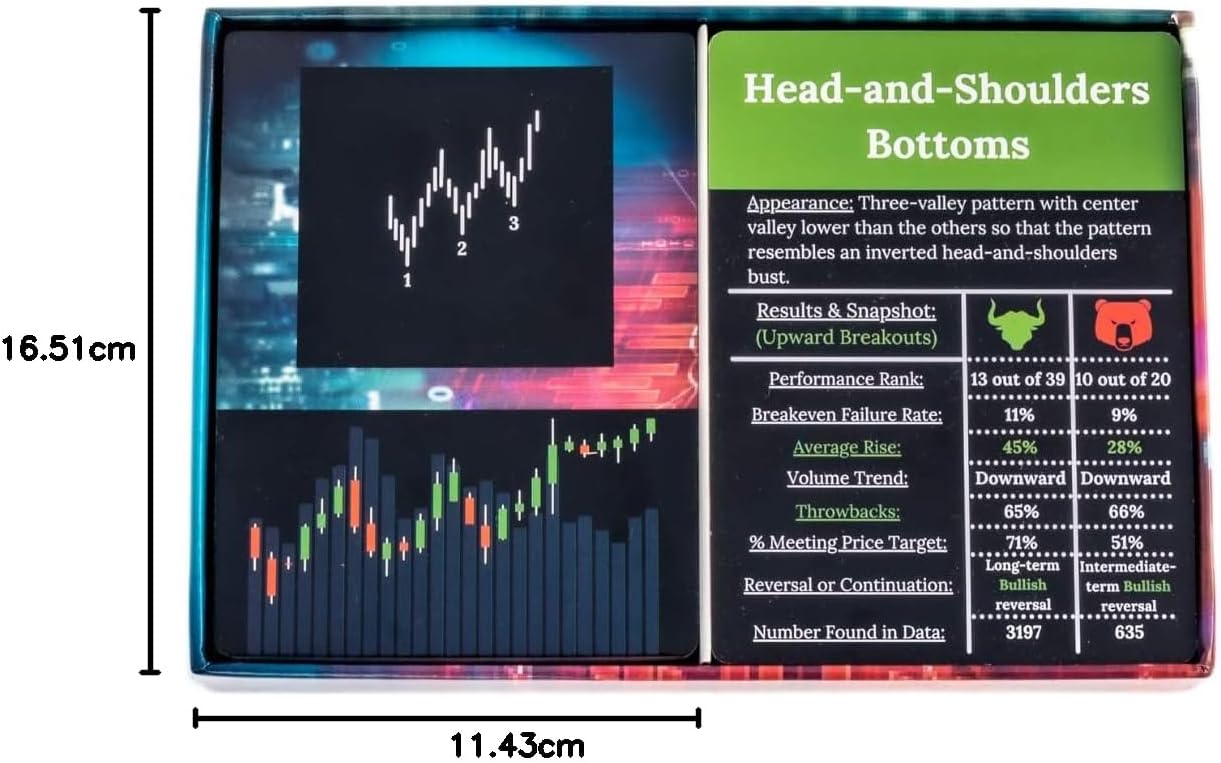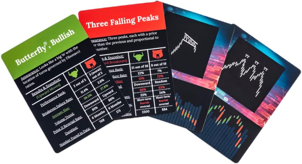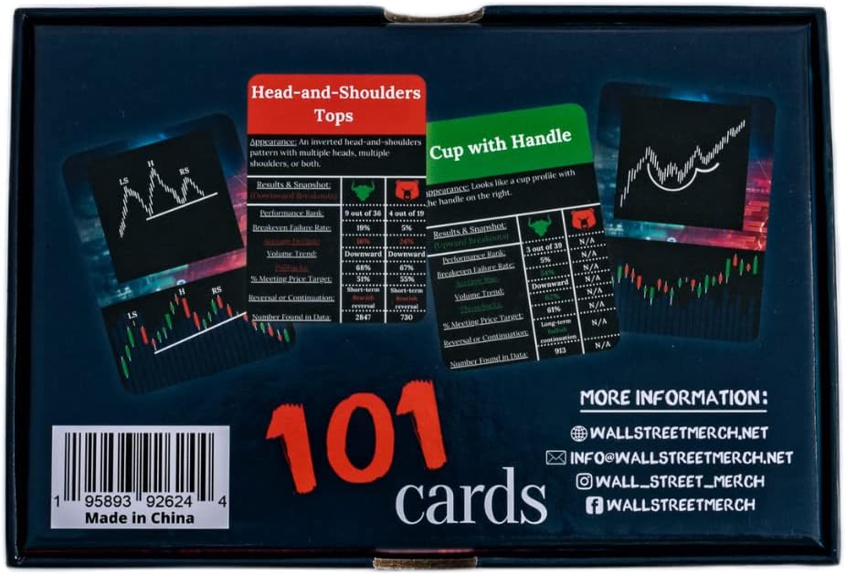 Have the knowledge of the Encyclopedia of Chart Patterns in the palm of your hand. You can use these cards to memorize both stock market chart patterns, their names, and how they’ve performed statistically. Learn which chart patterns are Bullish / Bearish in theory, but actually statistically perform opposite. If you or someone who know is just starting to learn about trading stocks this makes a perfect and unique gift! The cards have some important statistics on them including, performance rank, breakeven failure rates, average increase/decline, if they’re a reversal or continuation pattern, and the percent that meet their price target. -The data and statistics are from 1,396 stocks from 1991-2020. In the creation of these cards I sourced all data and statistics from The Encyclopedia of Cart Patterns by Thomas Bulkowski. I highly recommend the book as it has infinitely more data and statistics to supplement the cards. LIMIT OF LIABILITY/DISCLAIMER OF WARRANTY -While the author has used their best efforts in preparing these cards, they make no representations or warranties with respect to the accuracy or completeness of the contents of these cards and specifically disclaim any implied warranties of merchantability or fitness for a particular purpose. The advice and strategies contained herein may not be suitable for your situation. You should consult with a professional where appropriate. The author shall not be liable for any loss of profit or any other commercial damages, including but not limited to special, incidental, consequential, or other damages.
