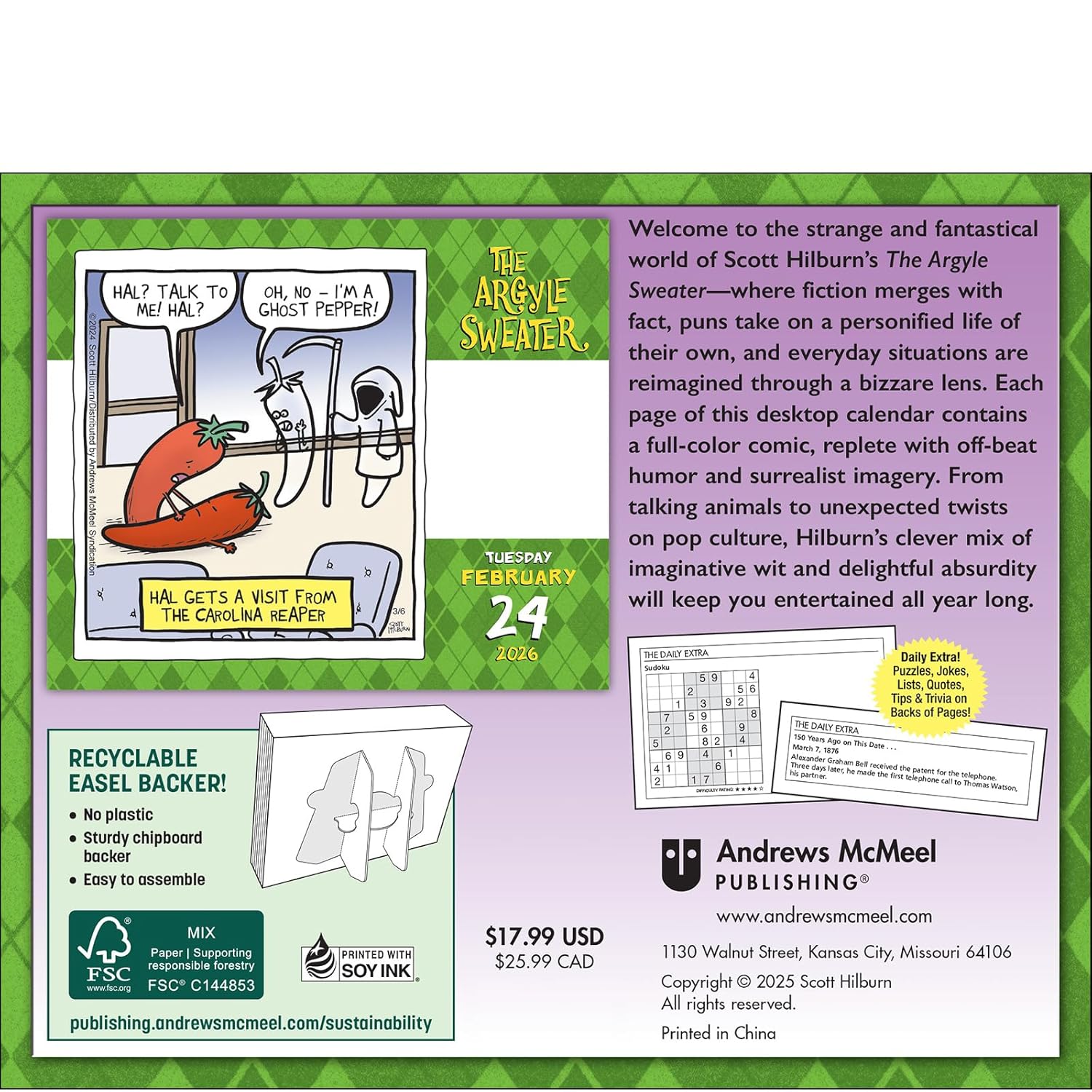 Features include: No single-use plastic Page size: 5.354″ x 4.488″ Recyclable chipboard easel backer for desk or tabletop display Printed on FSC® certified paper with soy-based ink Full-color tear-off pages Back of pages contain Daily Extra content such as puzzles, jokes, quotations, and trivia Day/Date reference on each page Combined weekend pages Official major world holidays and observances Each page features a different, humorous The Argyle Sweater comic