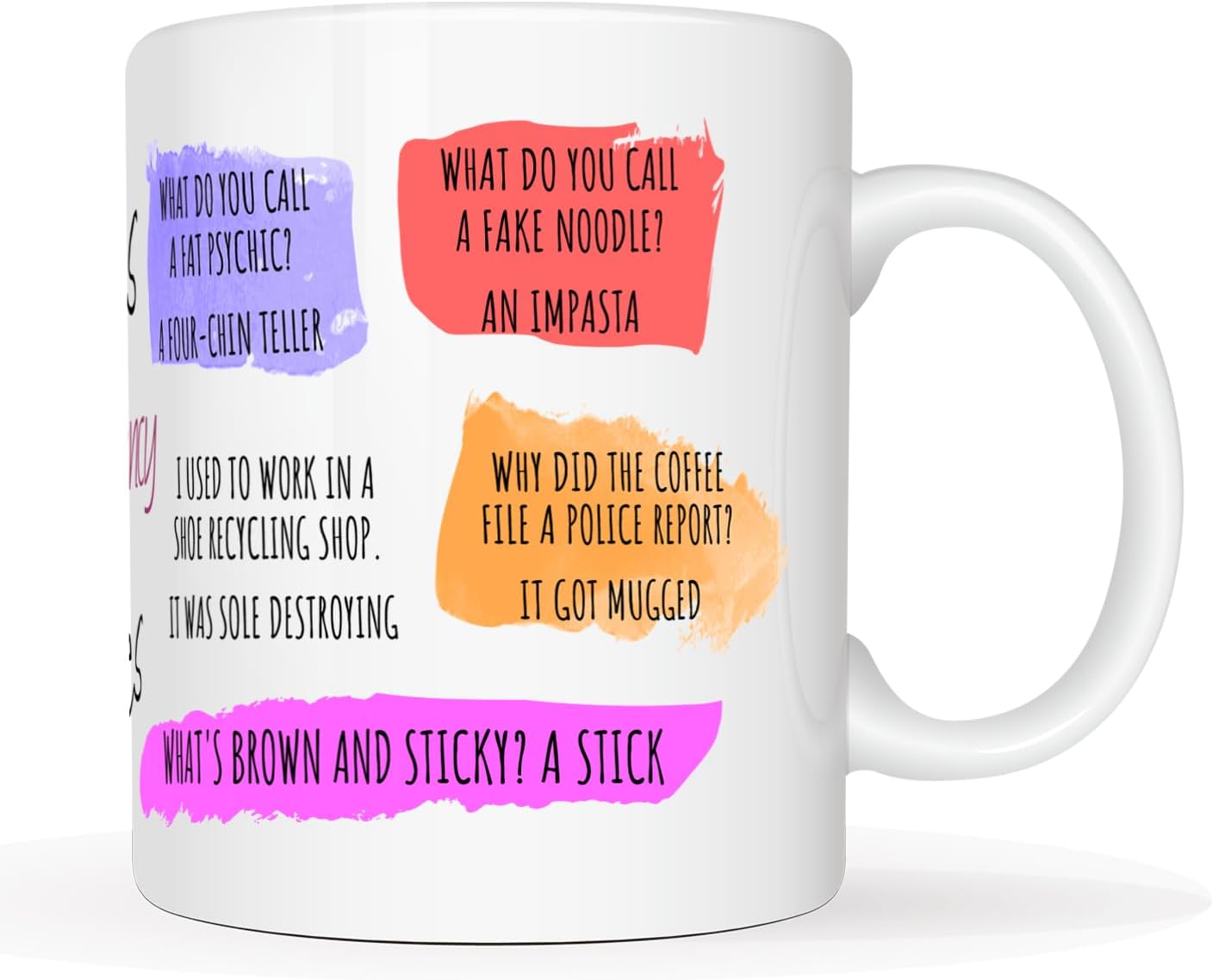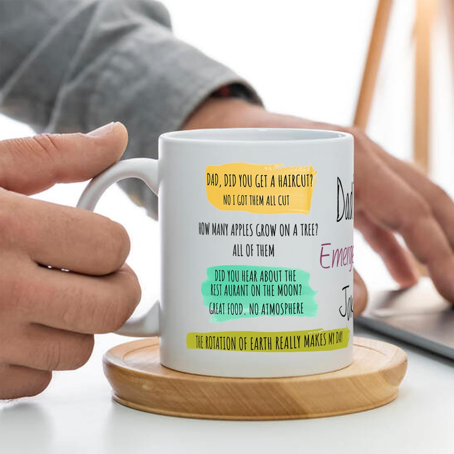 The phrase “Dad’s Emergency Jokes” is clearly scripted and centered on the front of the mug.