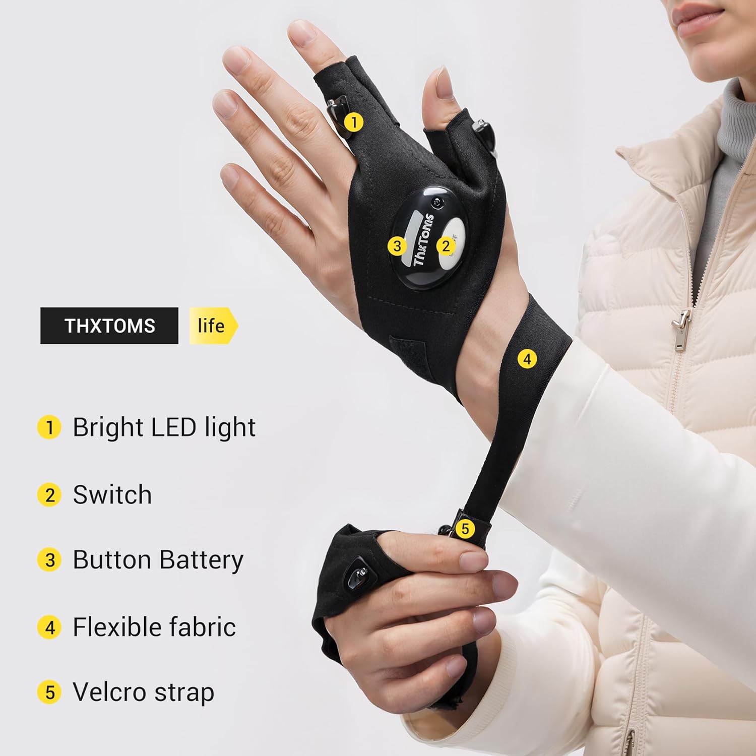 Your Versatile Tool for Work and Outdoor Adventures:These gloves with lights serve as a versatile multi-tool. For auto repair, they help locate screws; for night fishing, they illuminate line knots. Also useful as safety led finger lights for night running or as hands-free led flashlight waterproof gloves for emergencies, camping, hiking, or walking the dog.