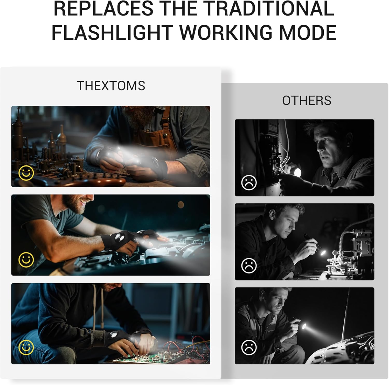 Professional Hands-Free Torch Gloves:Experience true hands-free lighting with these LED flashlight gloves. The finger torch design illuminates precise areas, perfect as fishing accessories for tying hooks or car repair to light up engine blind spots. Ideal as camping accessories or cycling accessories, these torch gloves for men are versatile gadgets for men that help improve efficiency in dark environments.