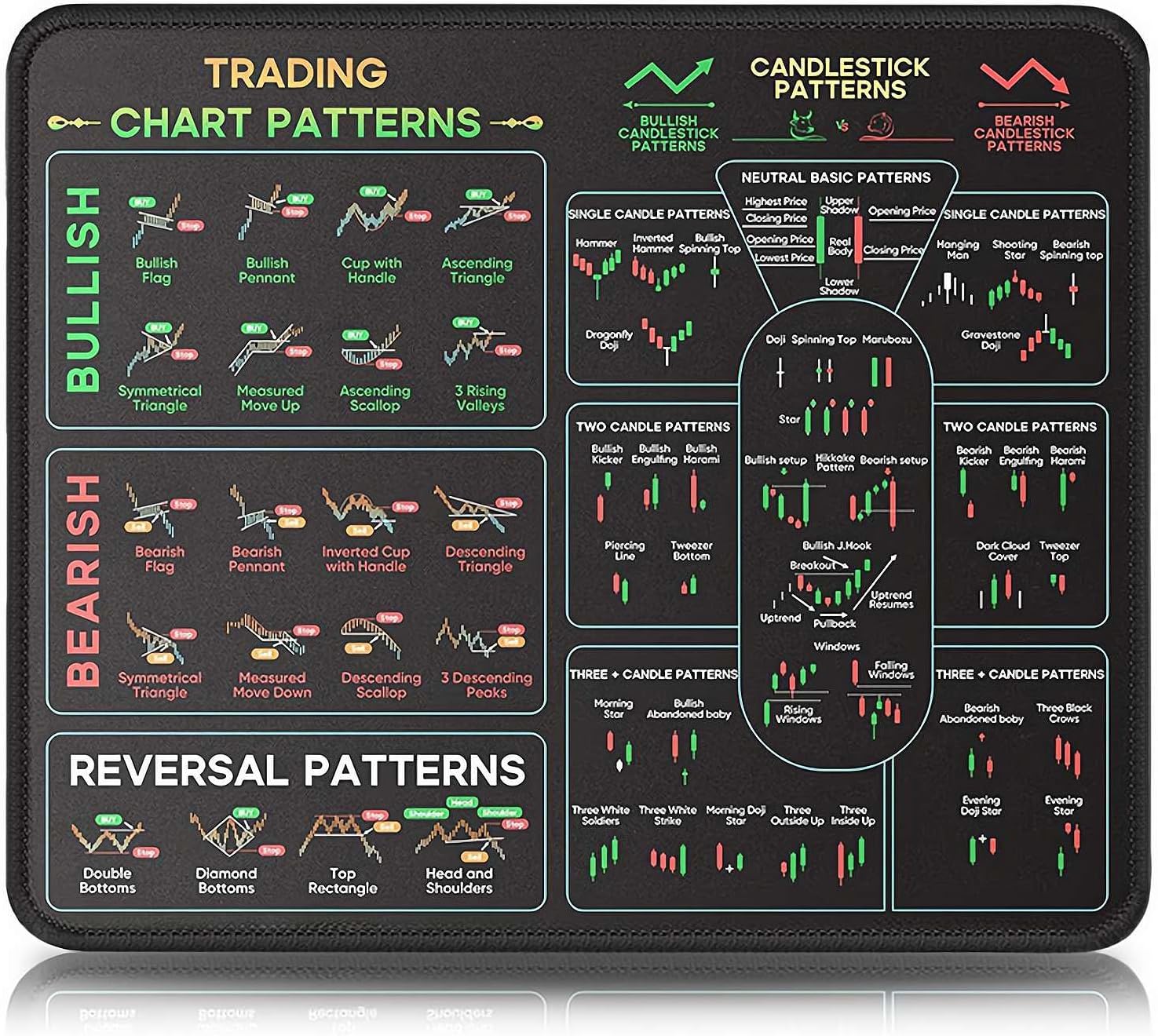 Essential Chart Pattern Reference: Features clear aesthetic graphics displaying common stock market and forex candlestick patterns and formations to turn your workspace into a visual learning tool