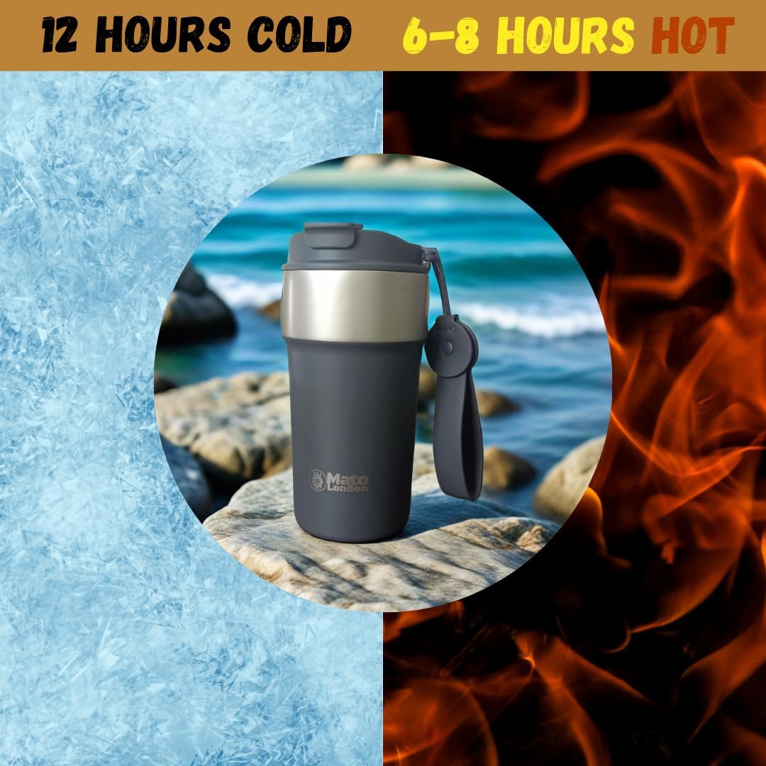 MATO LONDON Premium Insulated Coffee Cup: This stylish black grey travel coffee mug is perfect for hot drinks, keeping beverages at the ideal temperature for hours.