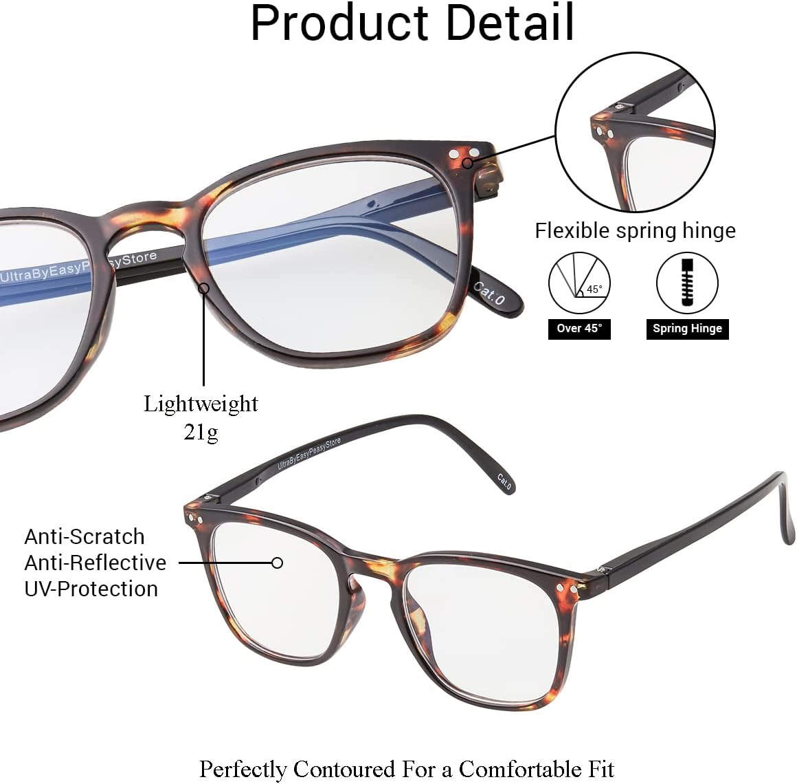 Lightweight comfort fit glasses, with strong spring hinges and contoured nose pads. With an anti-scratch coating and the blue light-blocking coating in the glasses, it cannot be rubbed off, like some others. Making them better than ever