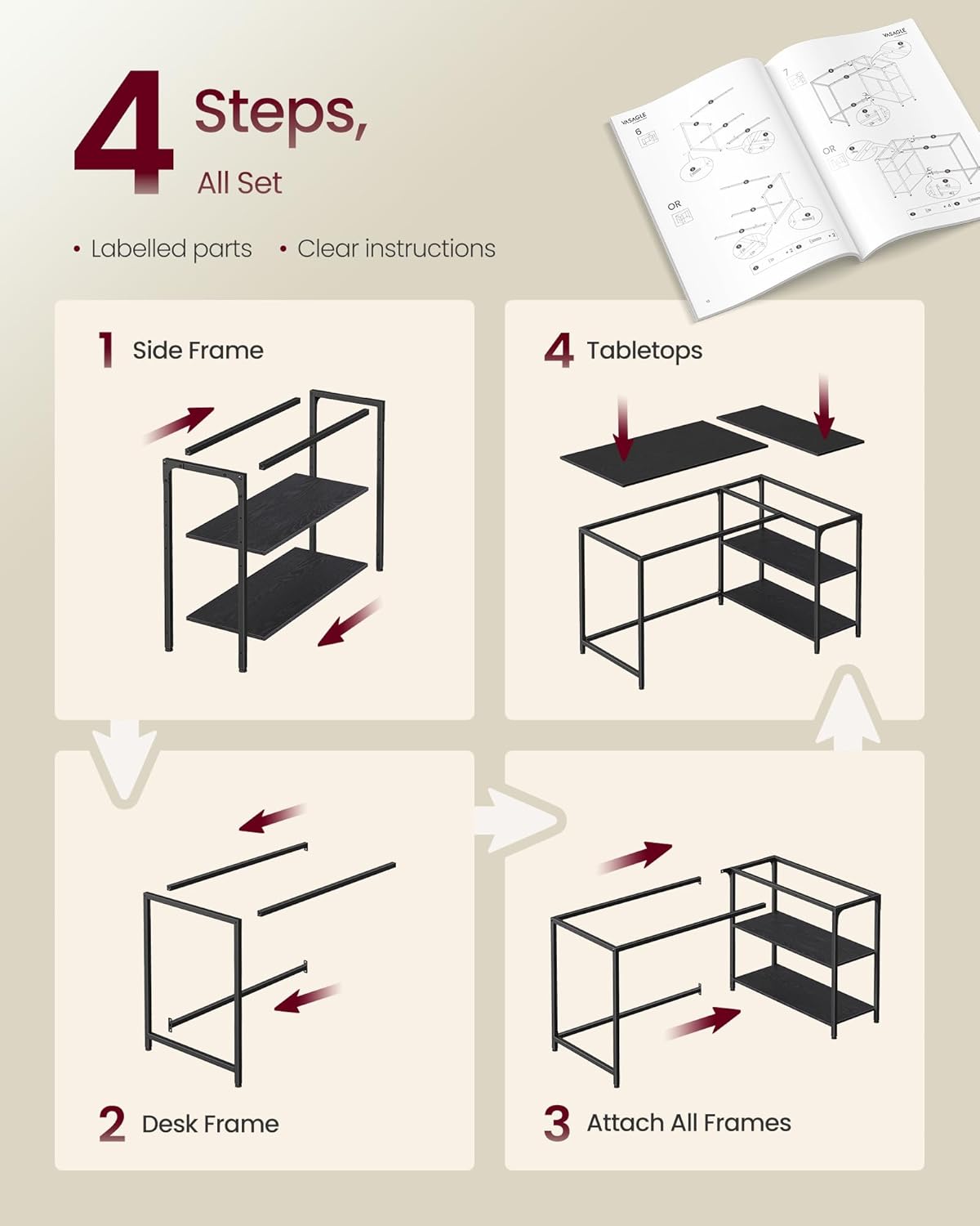 Hassle-Free Assembly: With clear instructions, labelled parts, and included tools, you can assemble this corner desk with storage quickly, and it blends easily with most modern home décor styles
