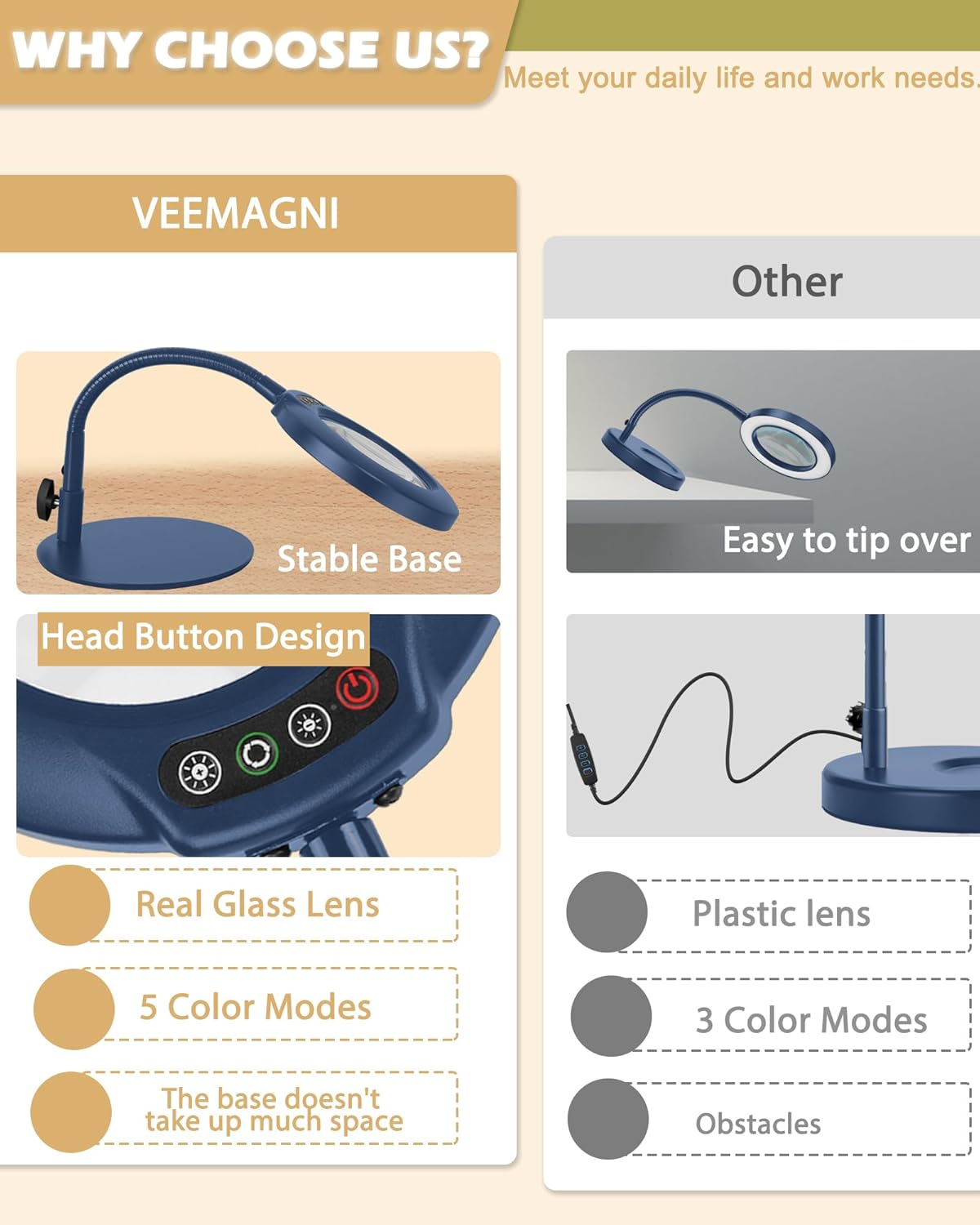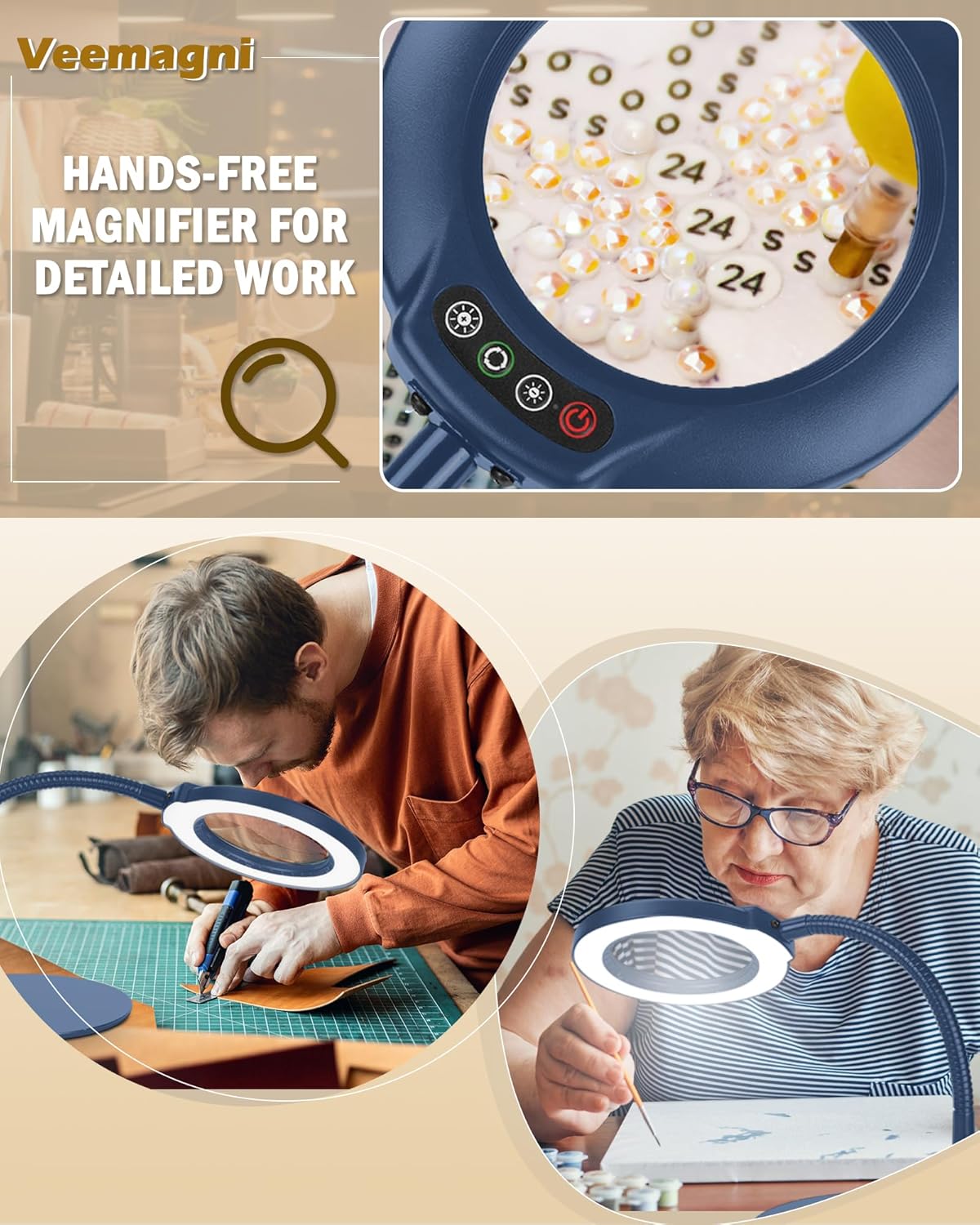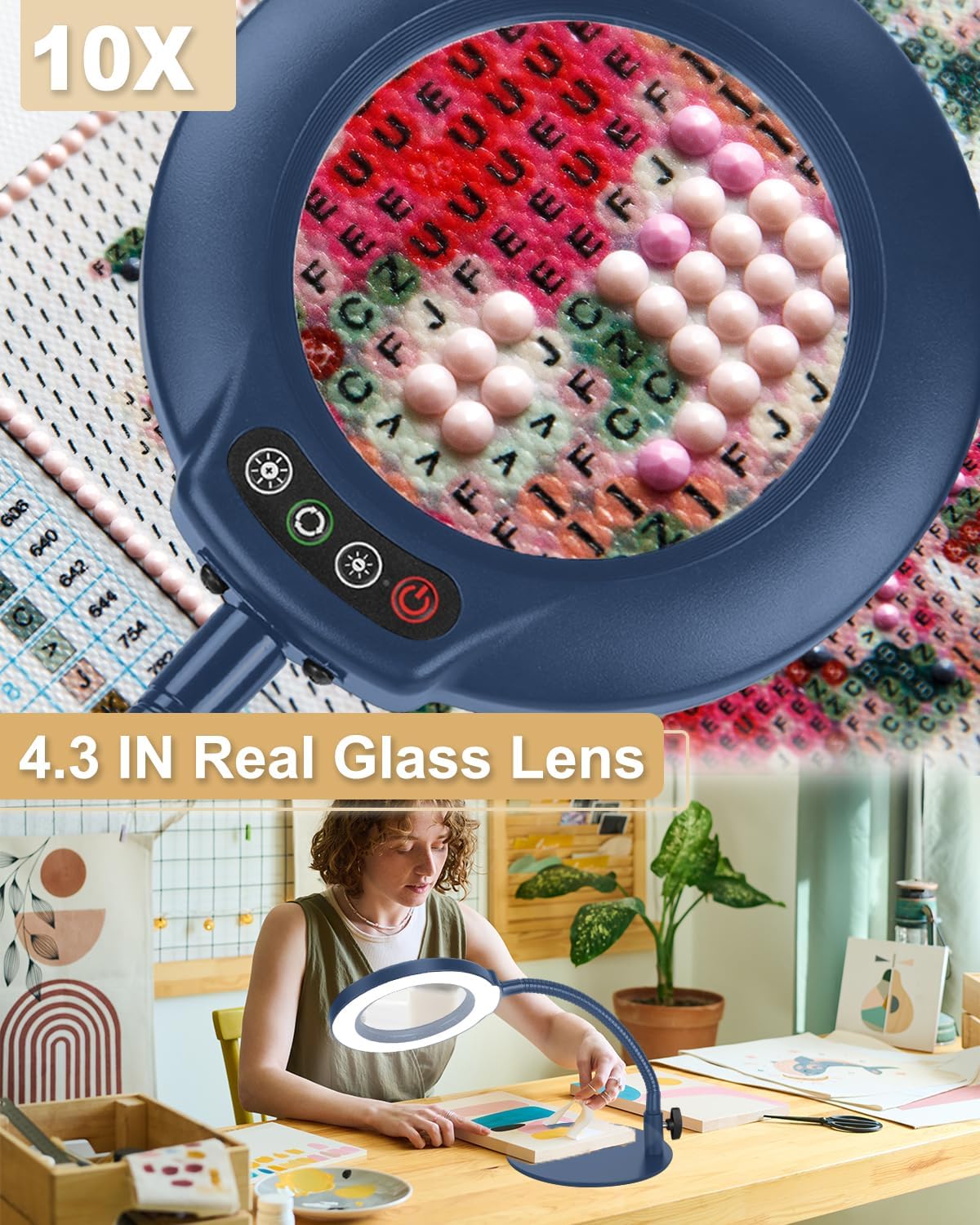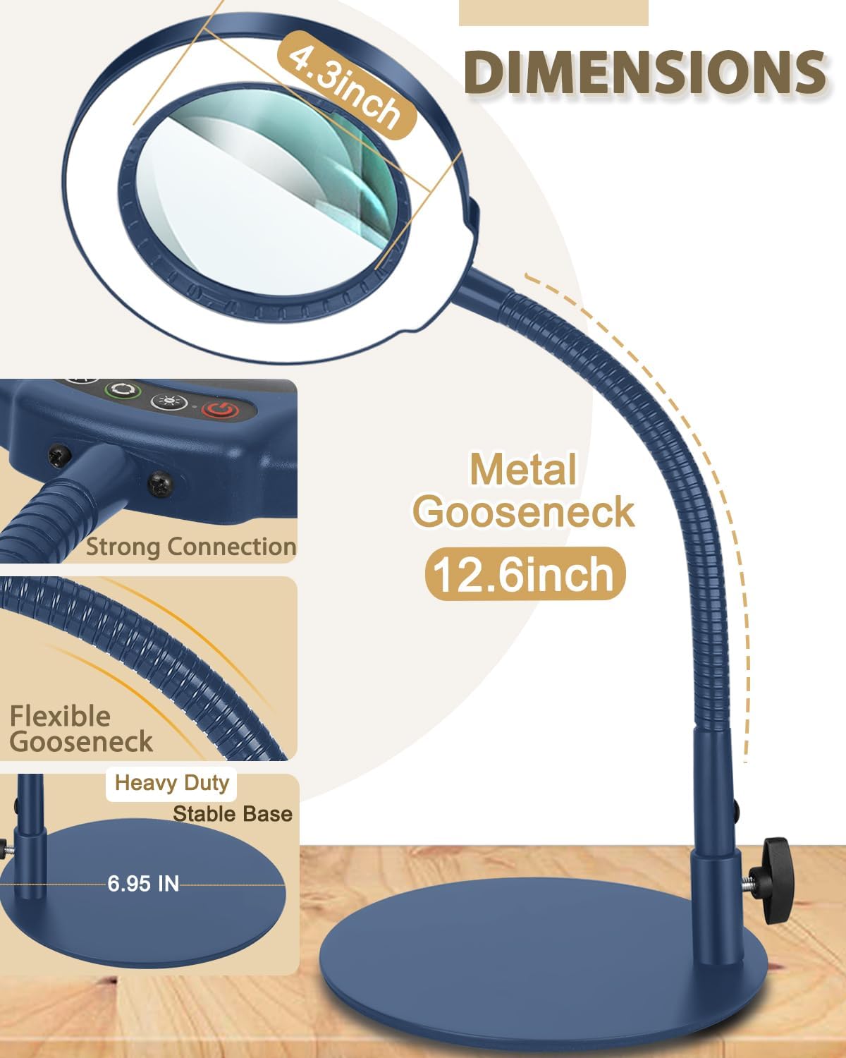 Sturdy and Stable Base – Our magnifying glass with light and stand features a 6.95 in round metal base equipped with non-slip padding, providing excellent stability and anti-drop protection. Its slim design allows it to fit easily into tight spaces, without taking up too much room, and can even support small items stacked on top. Ideal for detailed work such as crafts, sewing, repair, nail art, miniature painting, beading, fly tying, needlework jewelry making, diamond painting, and more.