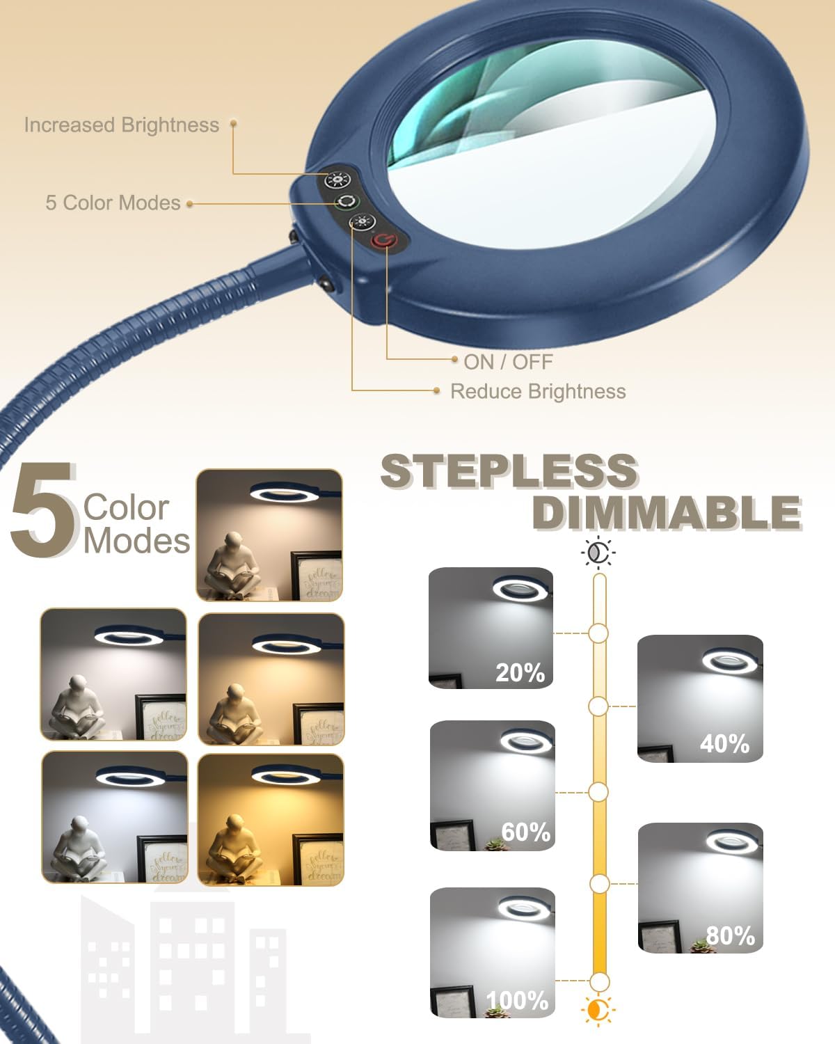 Customizable Lighting for Precision Work – Lighted magnifying glass with stand offers 5 color temperature settings and stepless dimming, allowing you to easily adjust the lighting to your specific needs. Whether you’re working on intricate tasks like painting miniatures, the adjustable brightness ensures optimal visibility and detail recognition. The built-in LED light provides even, flicker-free illumination, reducing eye strain and making it perfect for long hours of work.