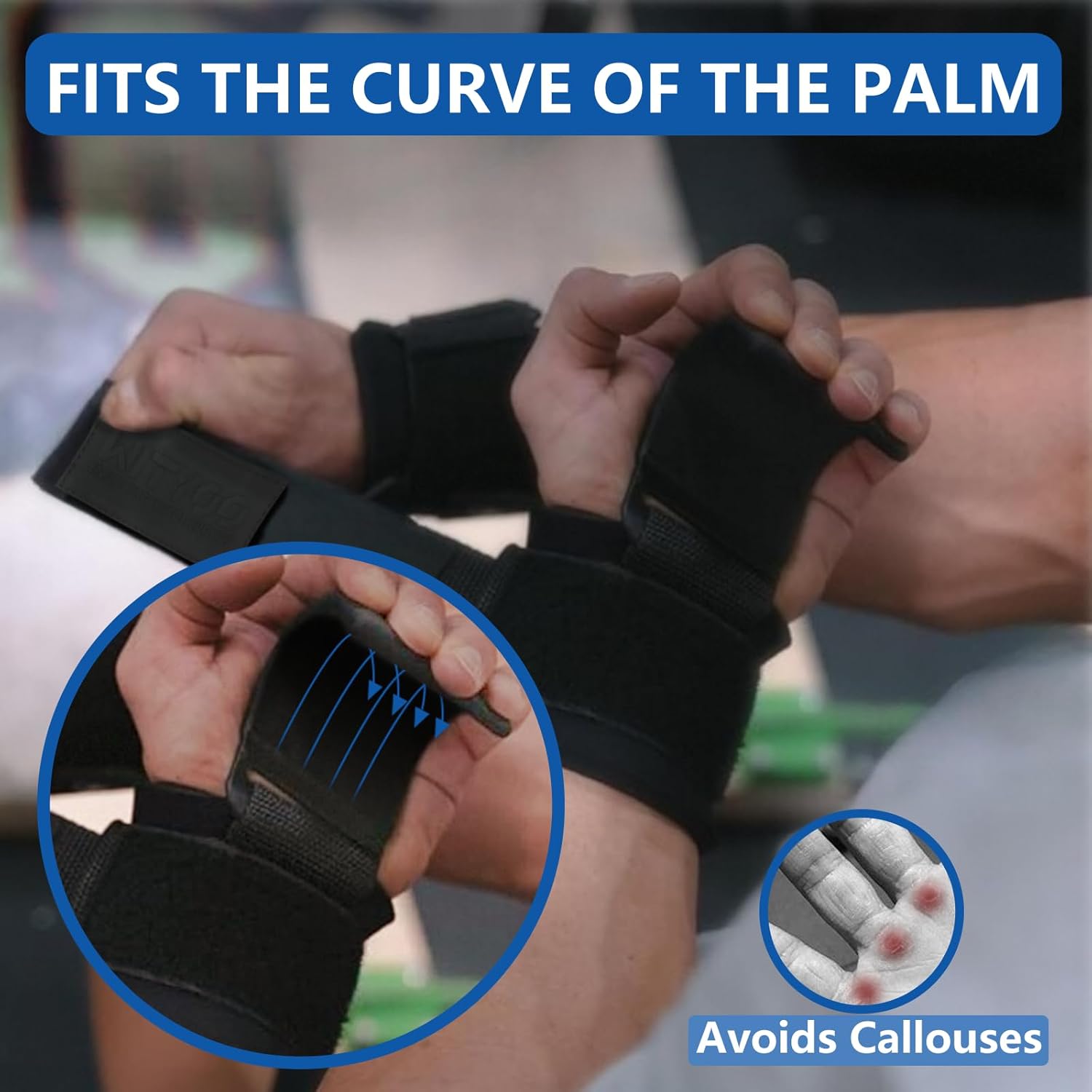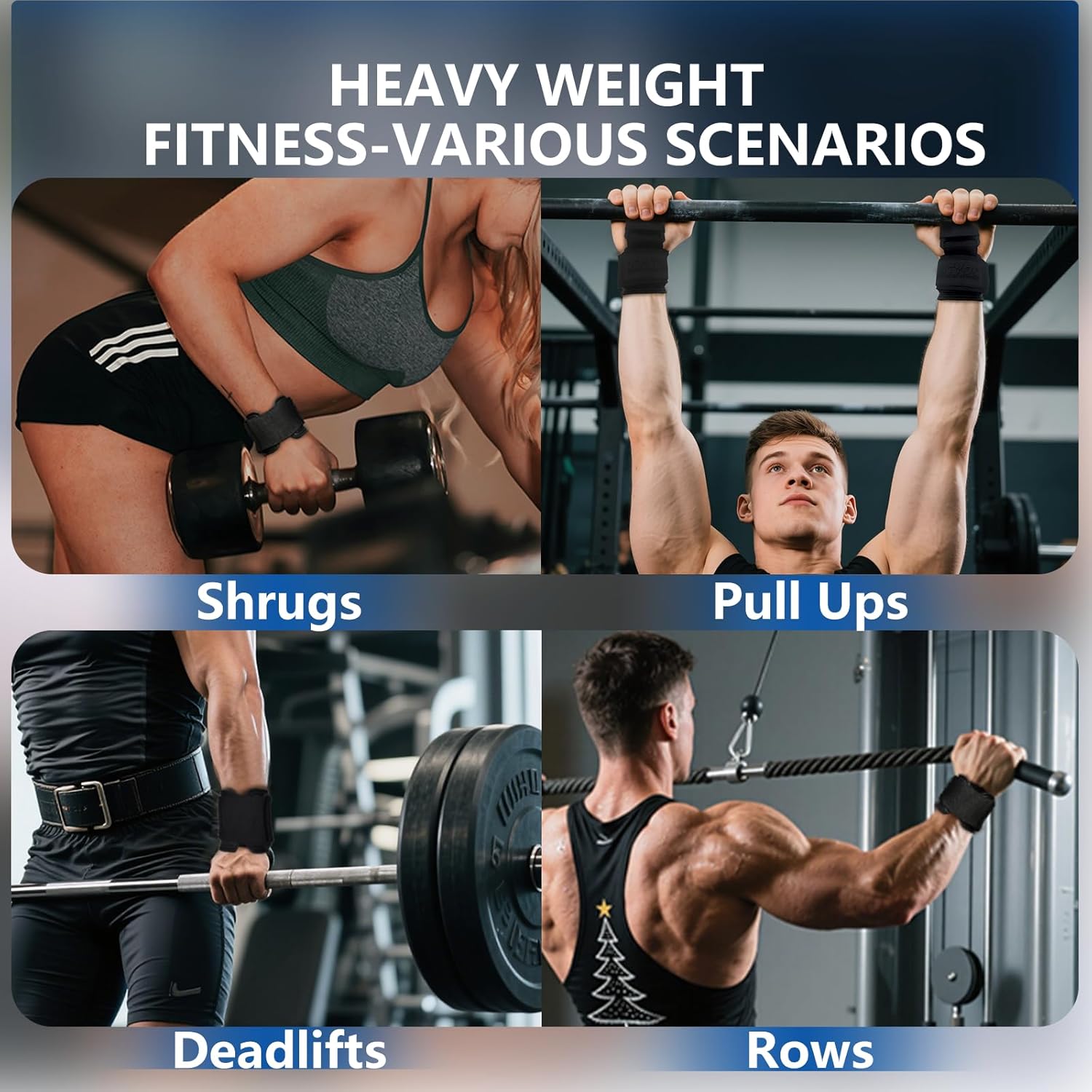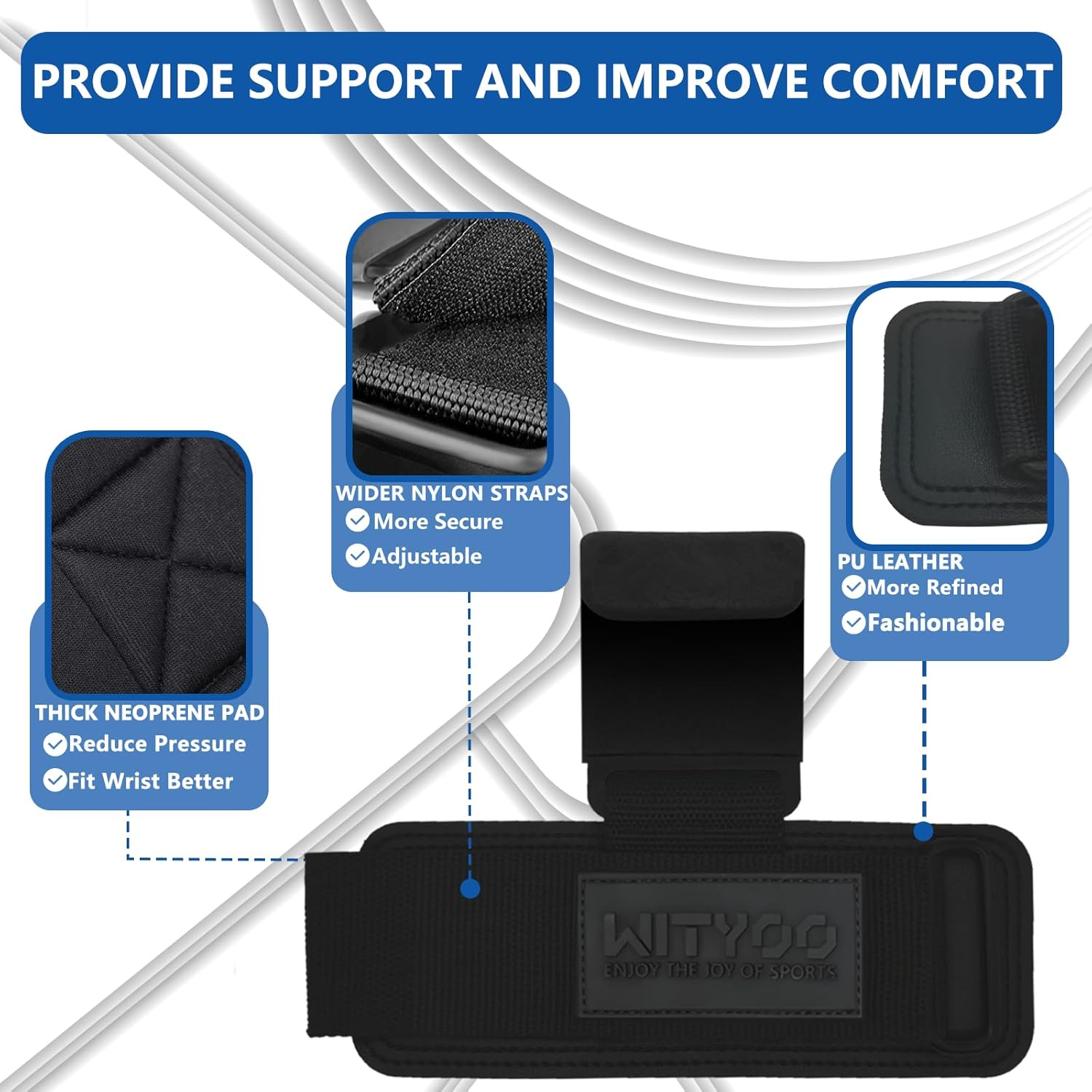 FITNESS COMFORT — The exterior of the wrist straps is wrapped with adjustable nylon straps for secure positioning, while the padding uses a dual-layer design: a soft PU surface and thick neoprene underneath to protect your palms and wrists during heavy lifts.
