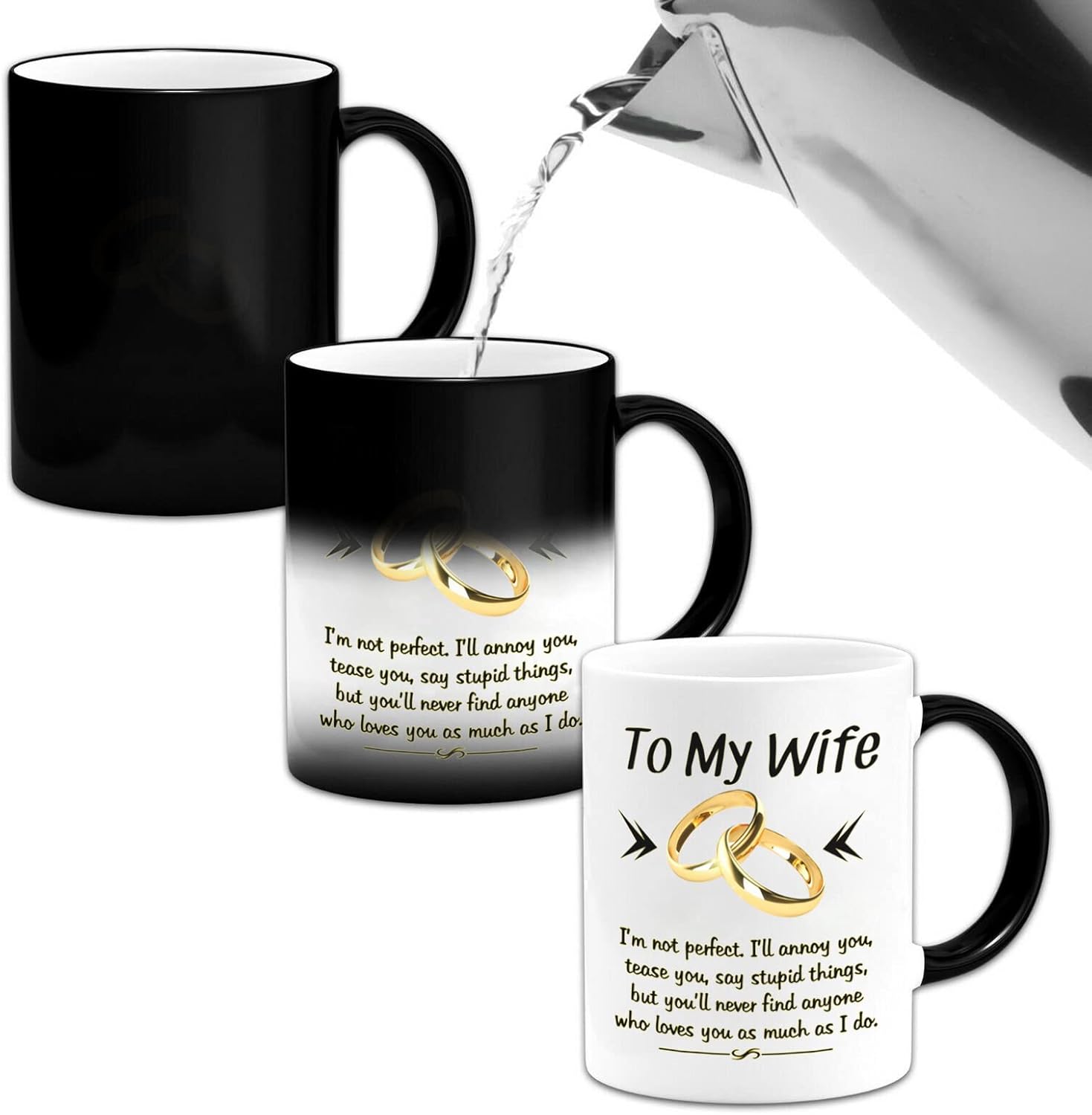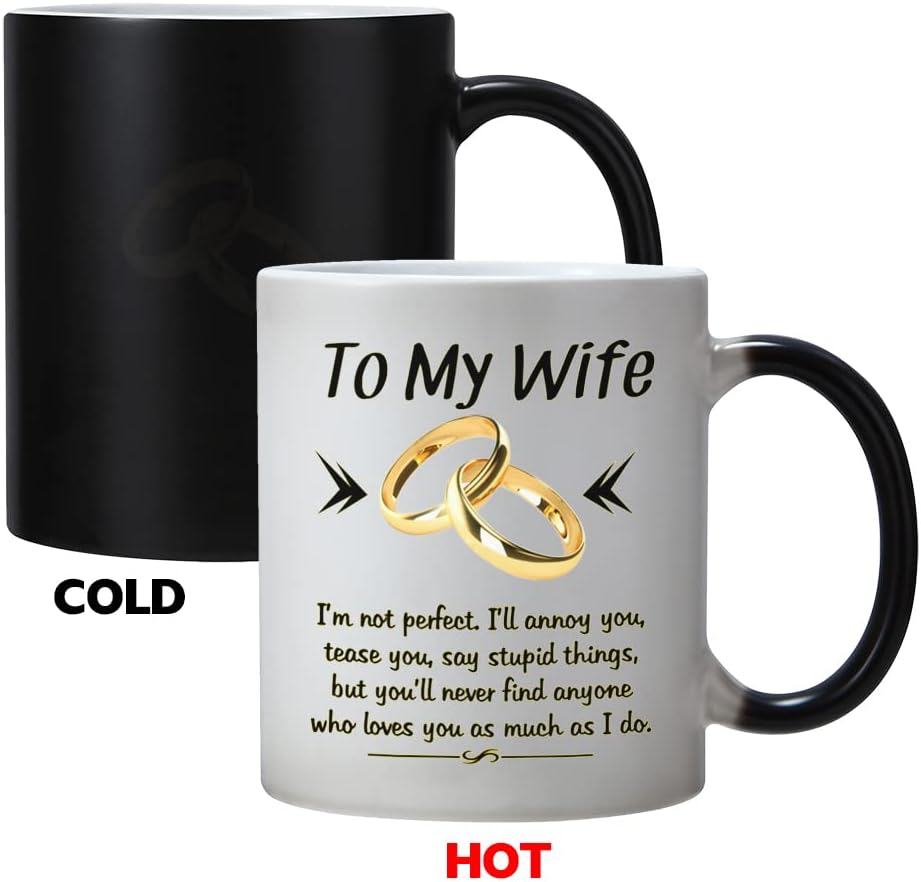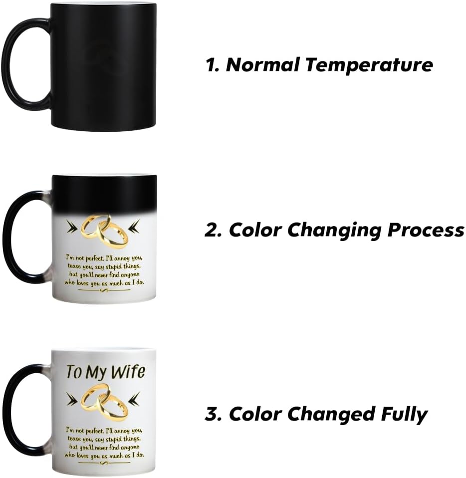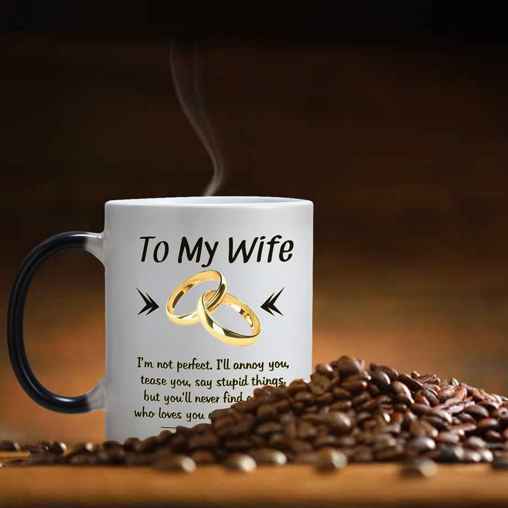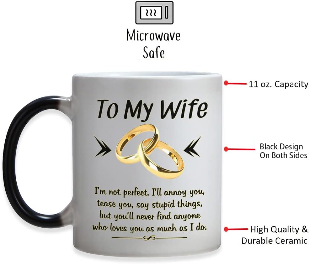 Design: To My Wife,I`m not perfect,I`ll annoy you,tease you,say stupid things,but you`ll never find anyone who loves you as much as I doHeat Changing Gold-and-Black design makes this mug more NovetlyDesign is on both sides of the cupAll designs are lead free.High quality ceramicMicrowave safeGreat for hot drinksComfortable, C-handle11 ounce capacityIndividually packaged in a white box