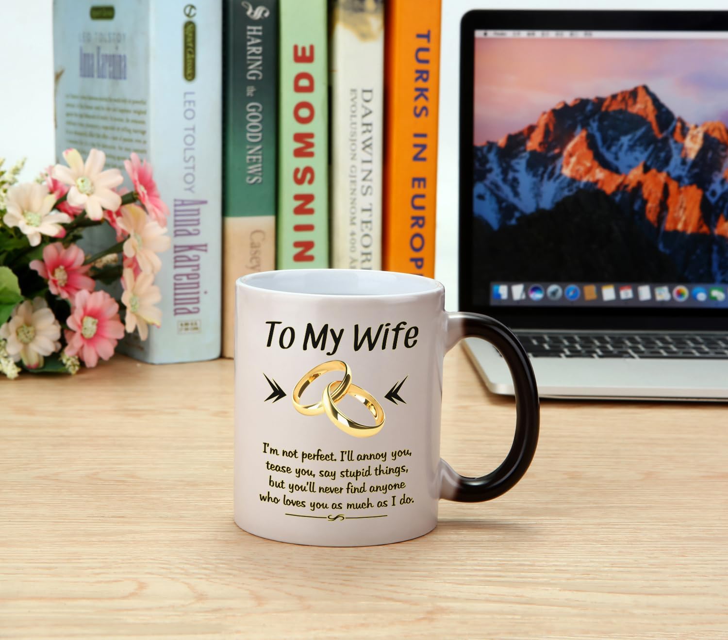 【11-OZ Color Change Wife Mug】This heat changing mug for wife is black in cold, when pour in hot liquid, it will turn white and appear the printing image.High quality ceramic, Wide mouth and large C-handle allow for every day use.Whether drinking your morning coffee at work,or sipping on a hot cup of tea at home, this mug is up to the task.This to wife mug is fun and practical which make it become the best wife gifts from husband.