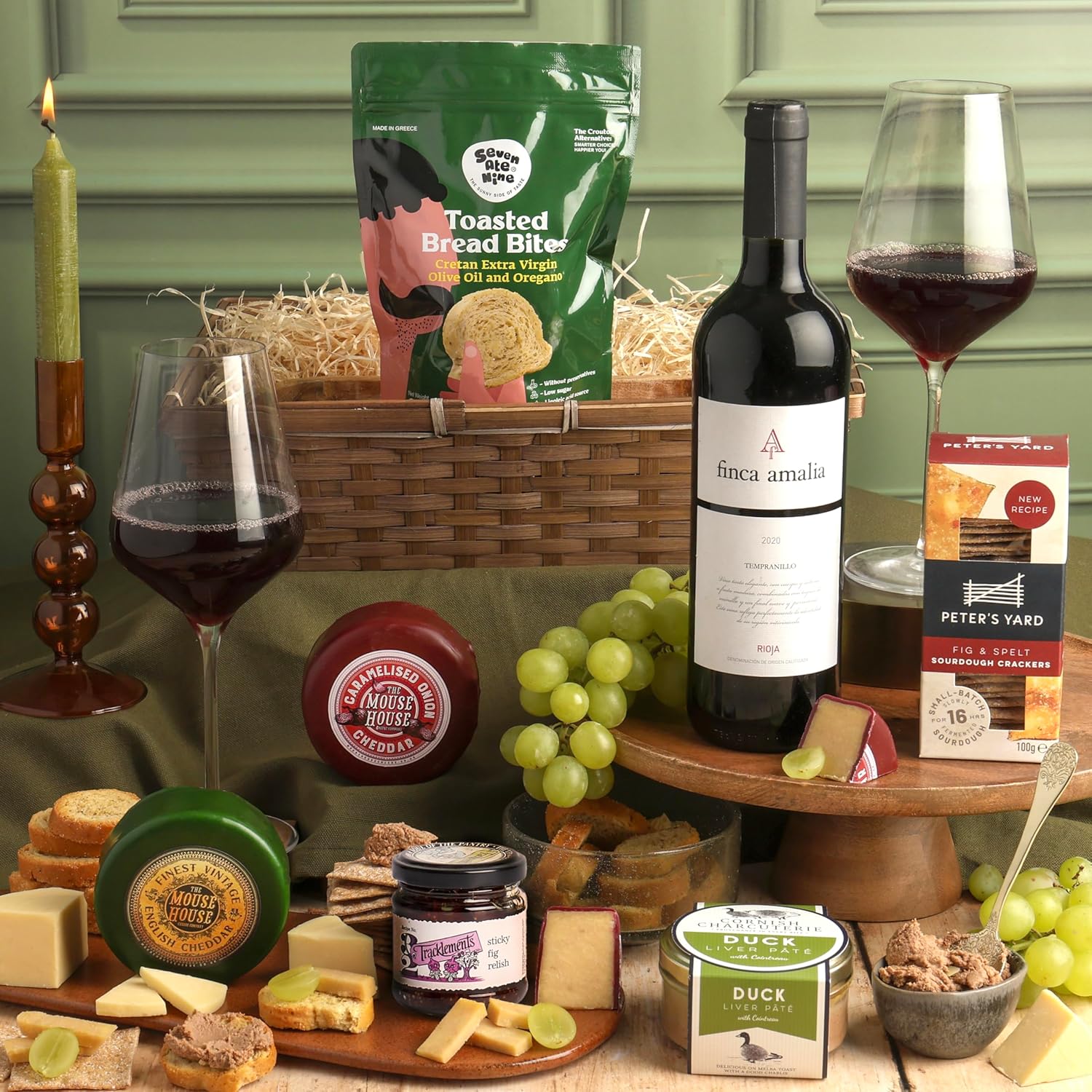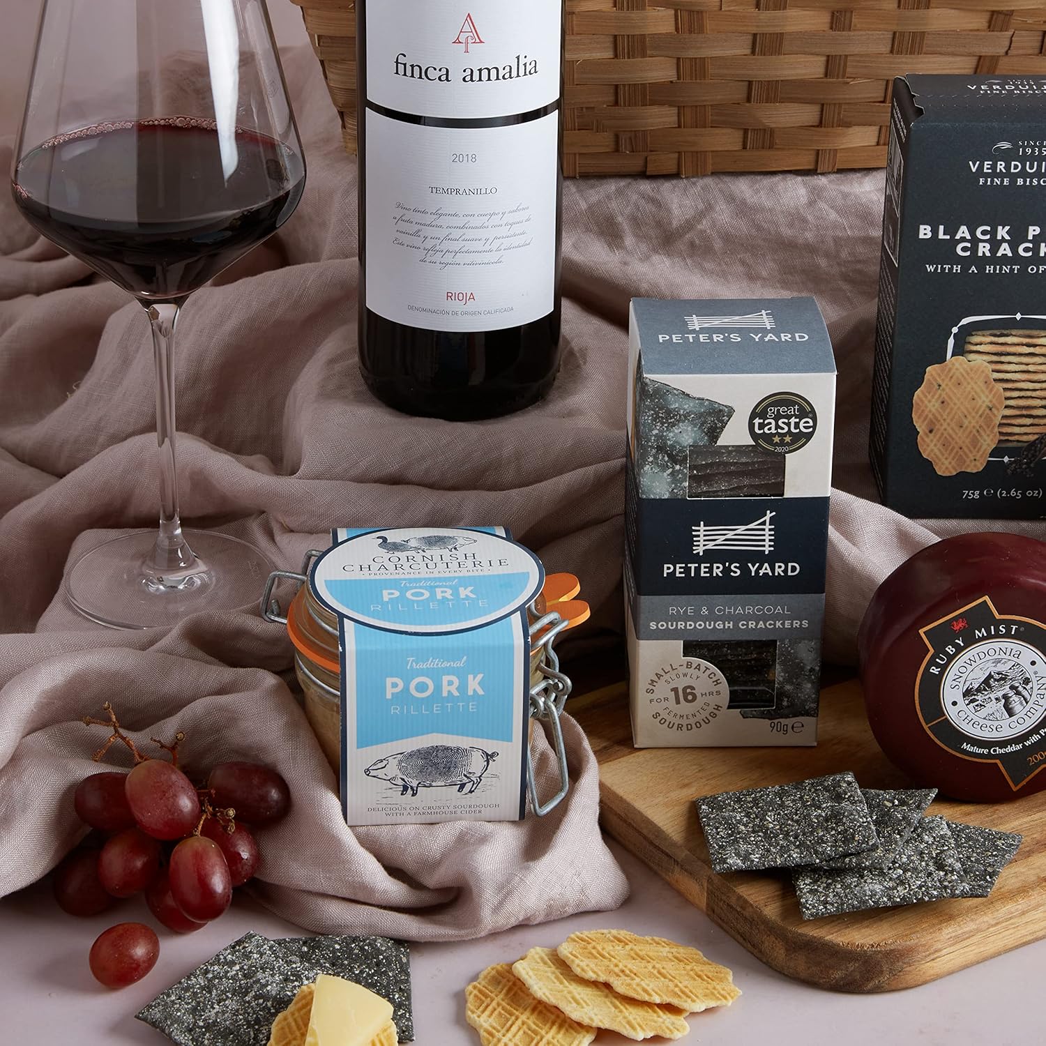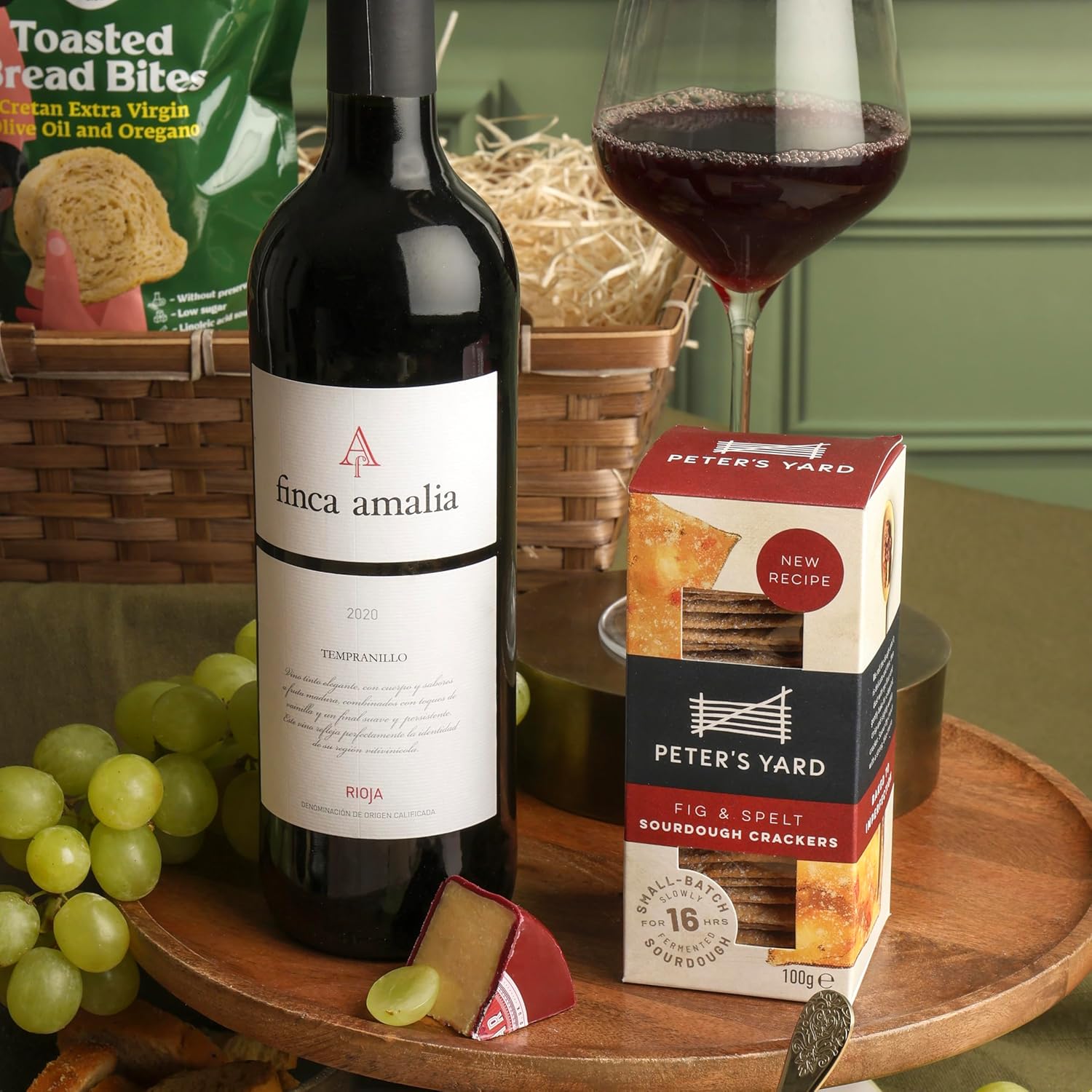 DELICIOUS FOOD AND DRINK HAMPER GIFT : A luxurious wine & cheese hamper featuring hand-selected Finca Amalia Rioja, award-winning cheese assortment, fig & spelt sourdough crackers & olive oil & oregano toasted bread bites, complemented by Tracklement’s sticky fig relish