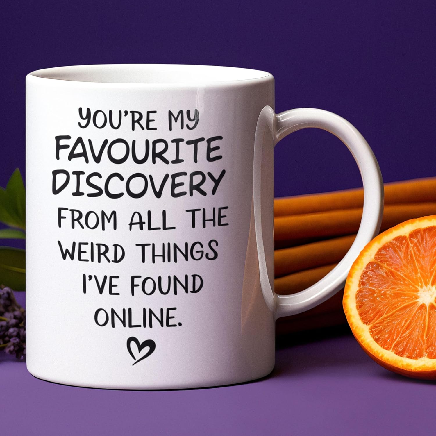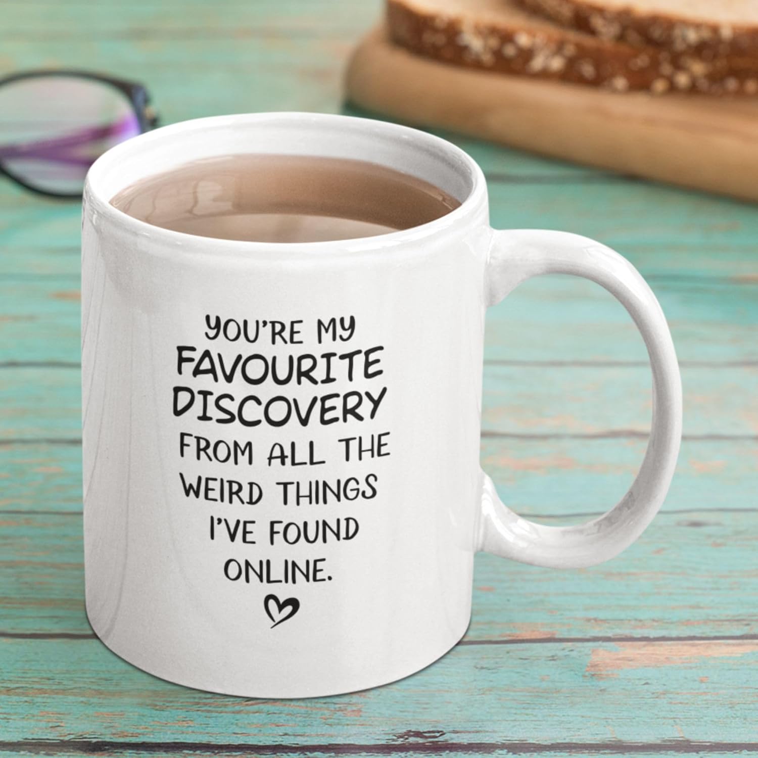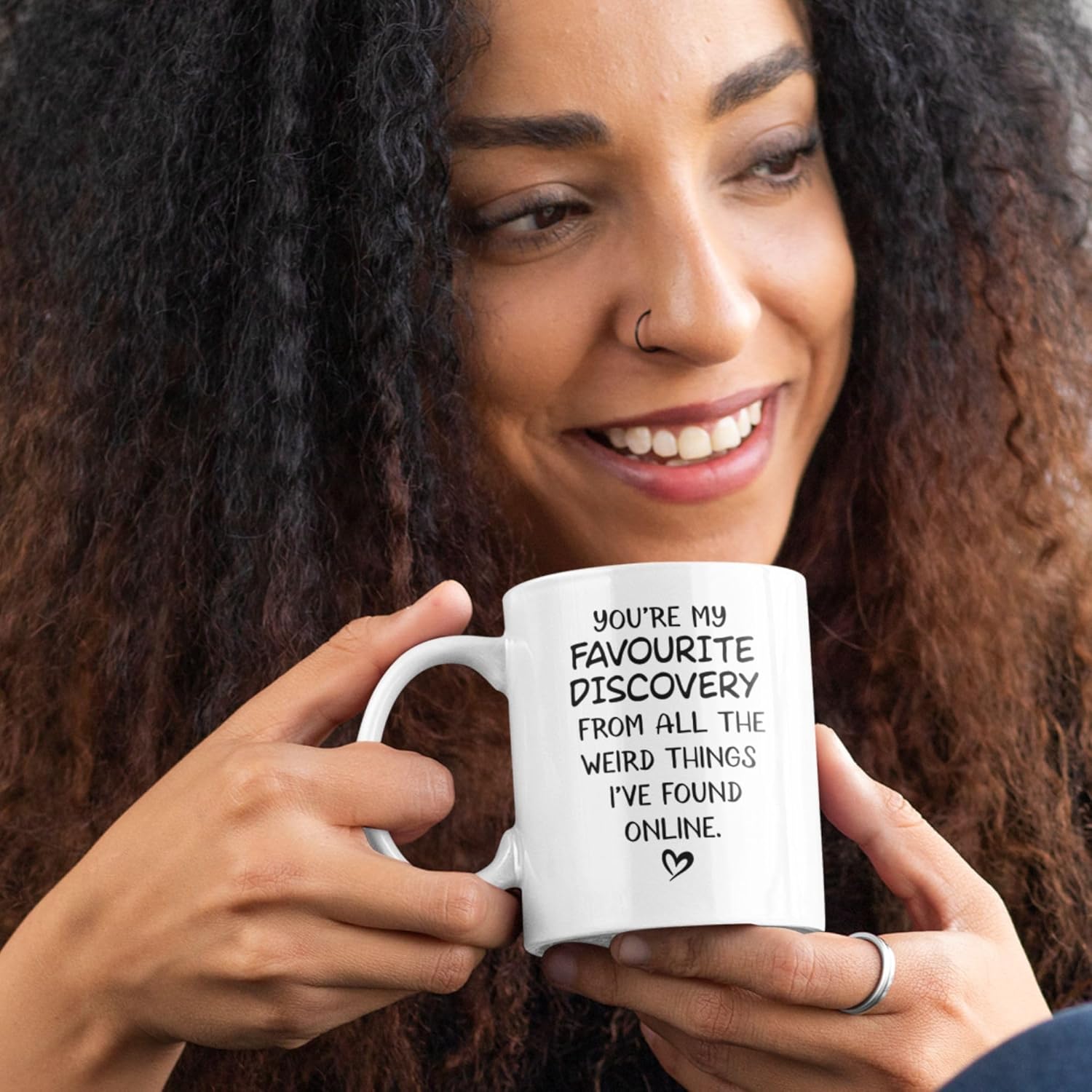 Discover the perfect way to say “I love you” with a twist of humor and affection. Our unique mug, emblazoned with the heartfelt message, “You’re my favorite discovery from all the weird things I’ve found online,” is not just a vessel for your favorite drinks; it’s a token of love, laughter, and the joy of finding someone special in the vast world of the internet. Ideal for Valentine’s Day, anniversaries, or just because, this mug is a testament to the quirky, unexpected journeys that lead to love.