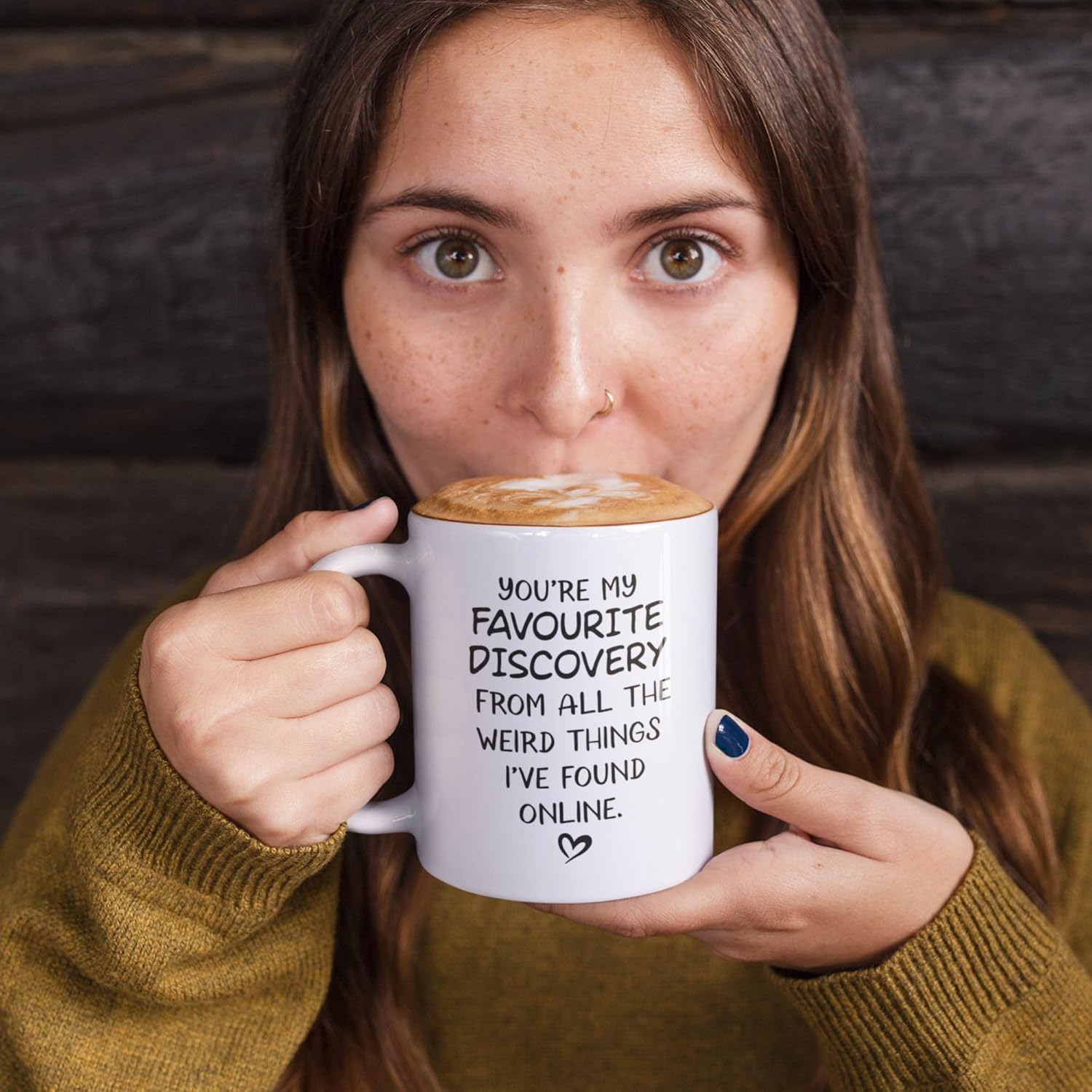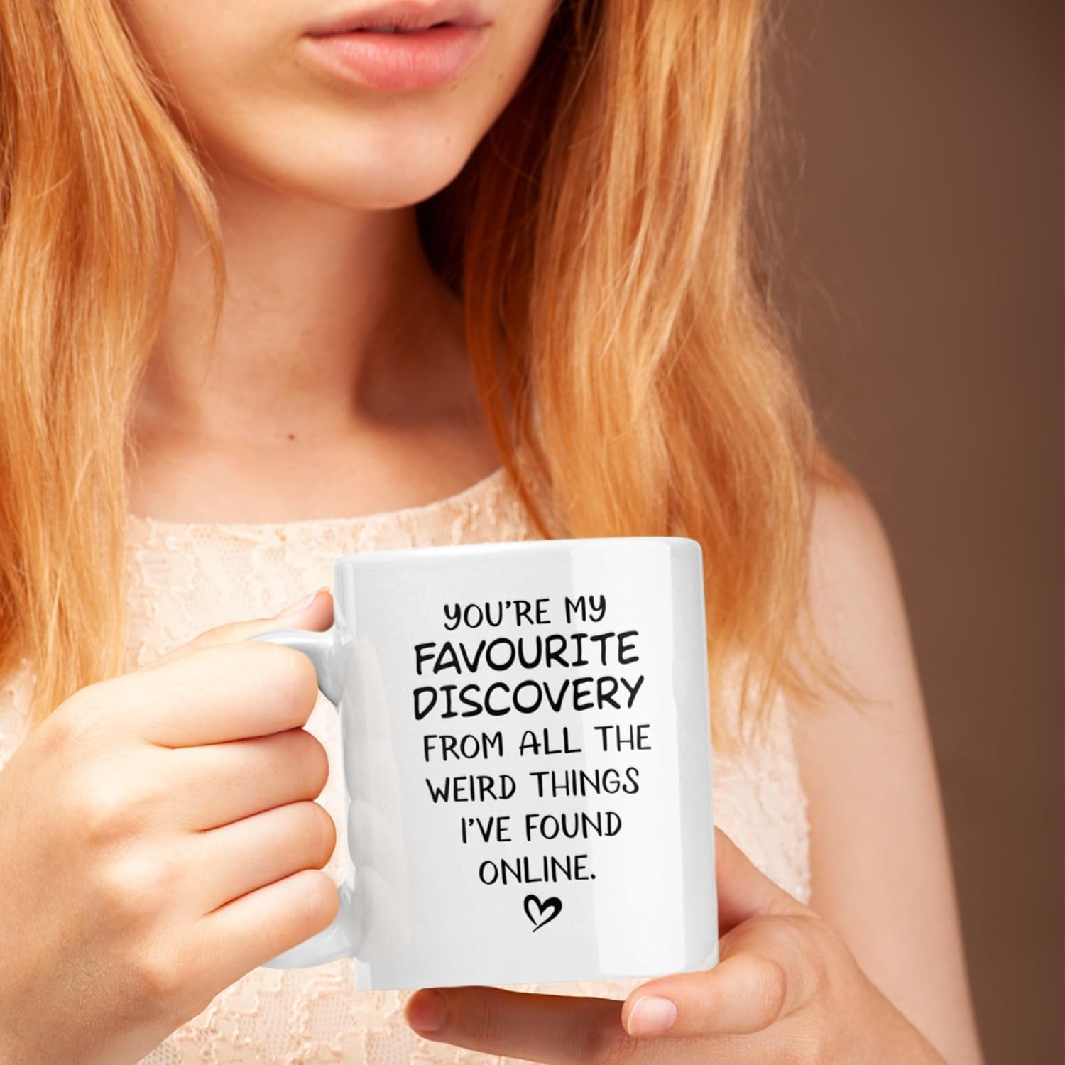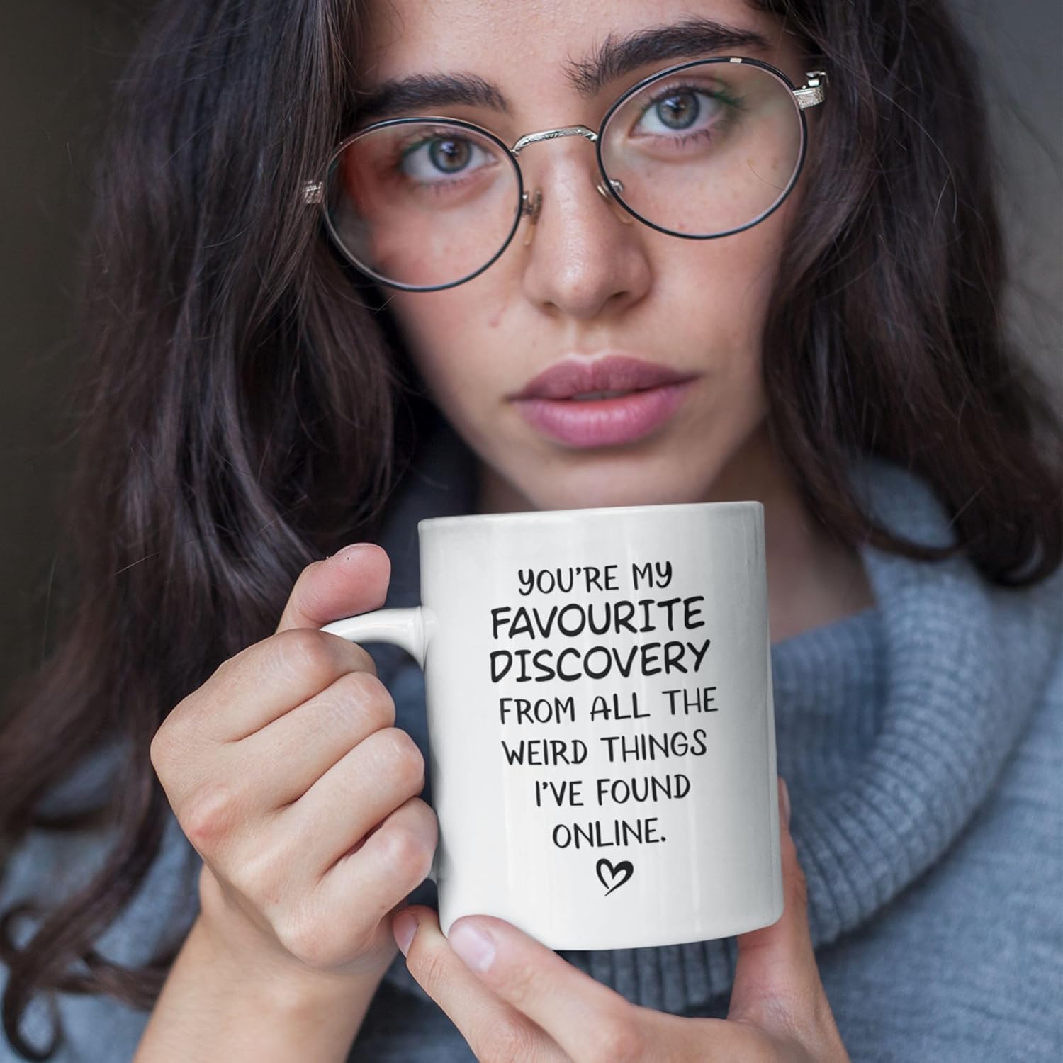 Discover the perfect way to say “I love you” with a twist of humor and affection. Our unique mug, emblazoned with the heartfelt message, “You’re my favorite discovery from all the weird things I’ve found online,” is not just a vessel for your favorite drinks; it’s a token of love, laughter, and the joy of finding someone special in the vast world of the internet. Ideal for Valentine’s Day, anniversaries, or just because, this mug is a testament to the quirky, unexpected journeys that lead to love.